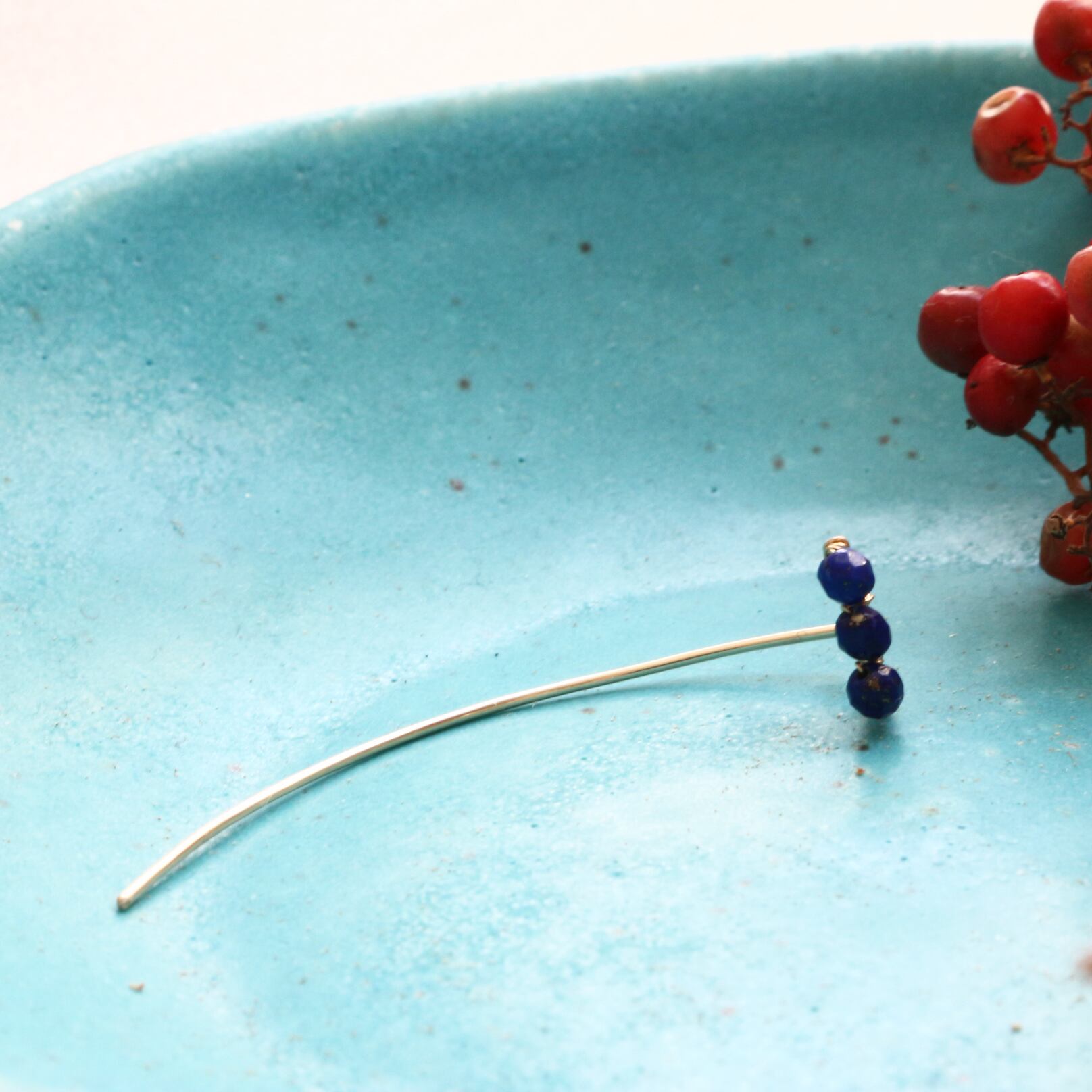 宇宙を思わせる深い青色の小粒が三つ並んだシンプルなピアスです。
