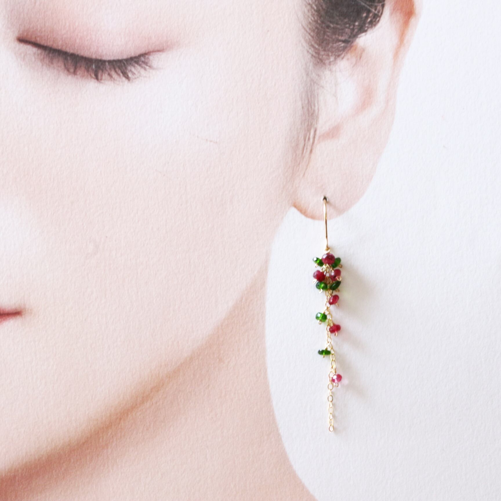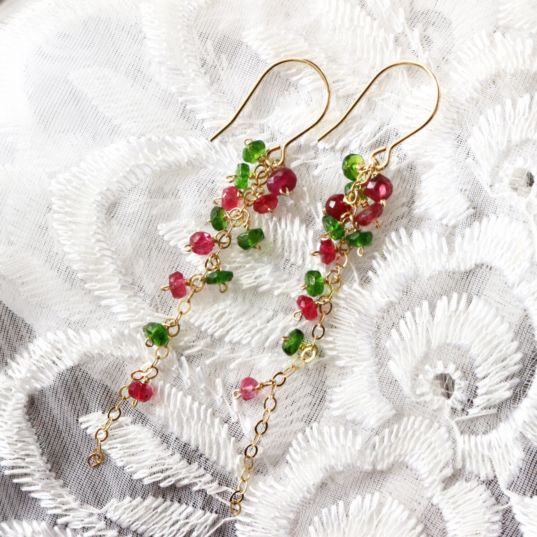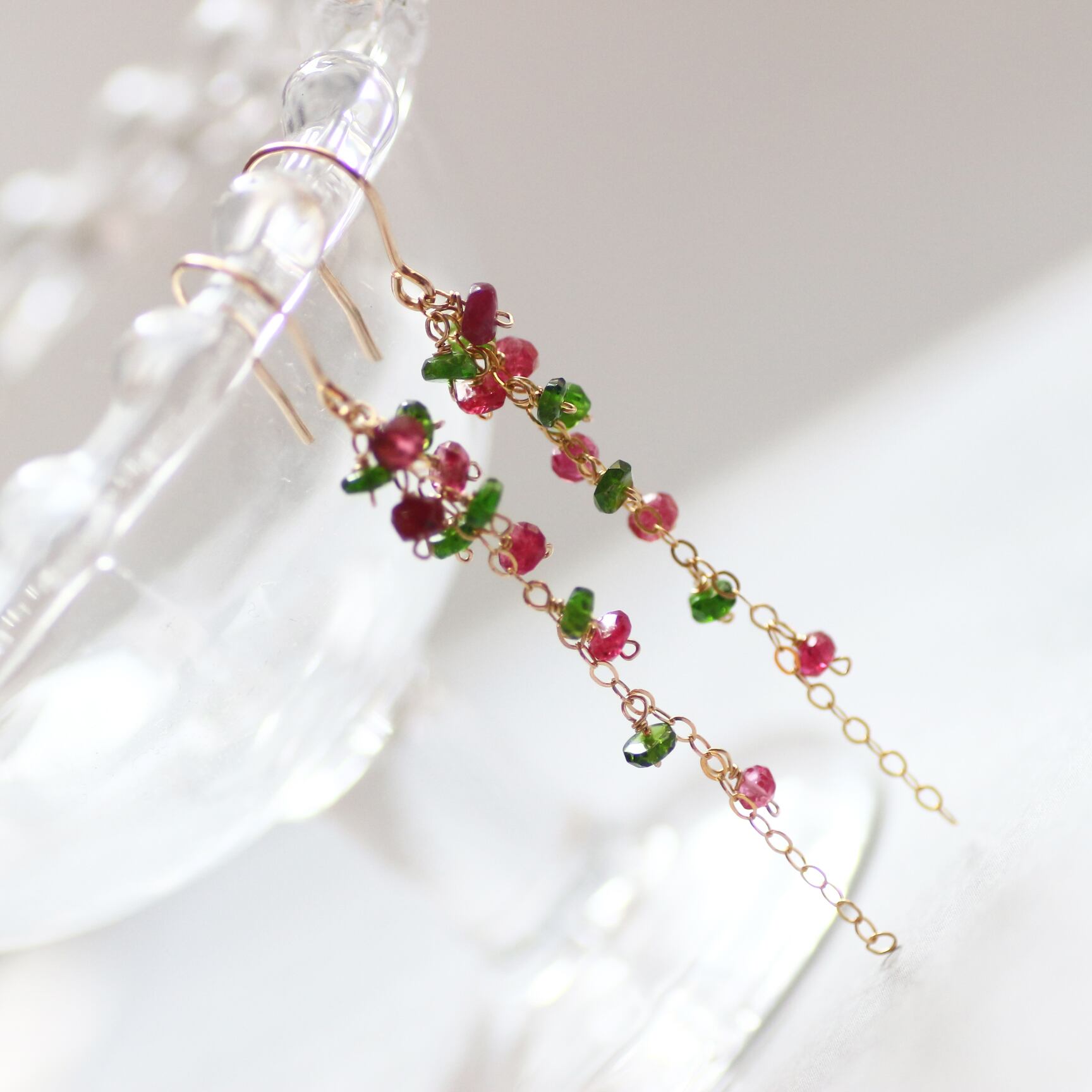 緑色、グロムダイオプサイトと、赤色、レッドスピネルのキラキラ小粒がシャラシャラと華奢なチェーンと共に耳元で輝きます。