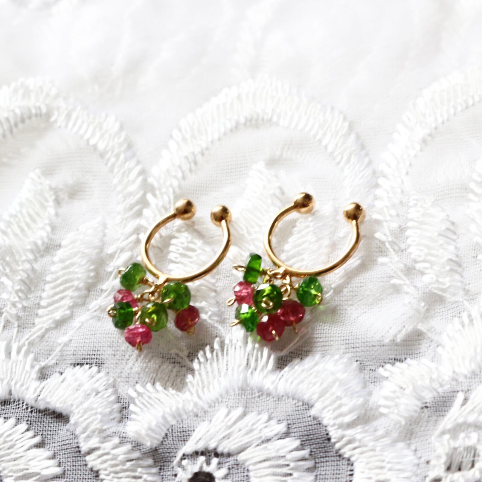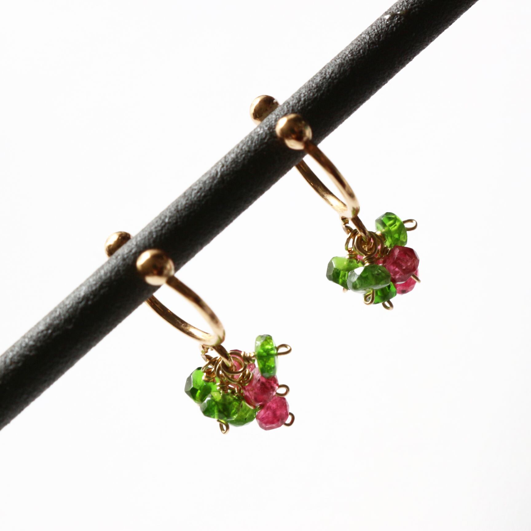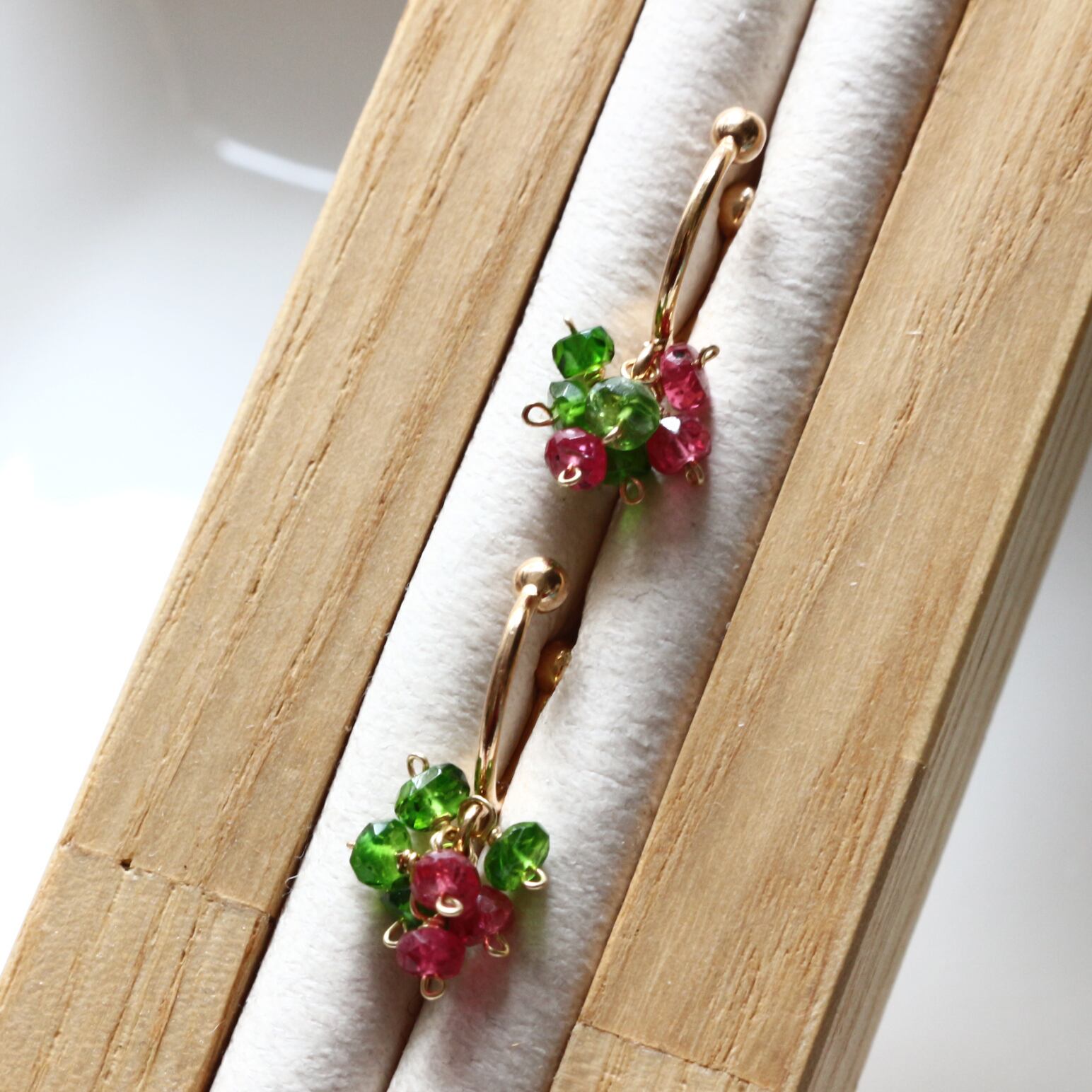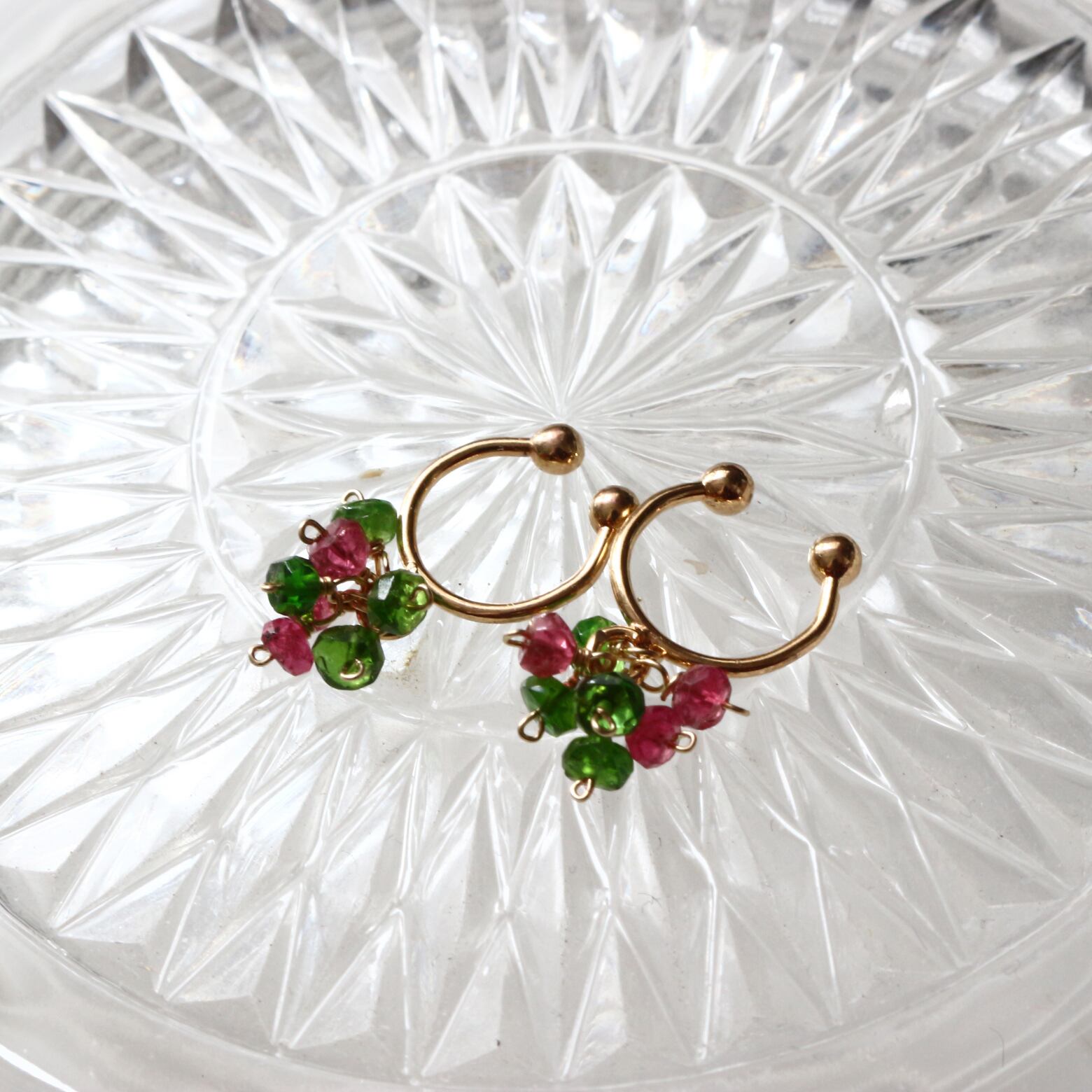 緑色、グロムダイオプサイトと、赤色、レッドスピネルのキラキラ小粒がシャラシャラと耳元で輝きます。