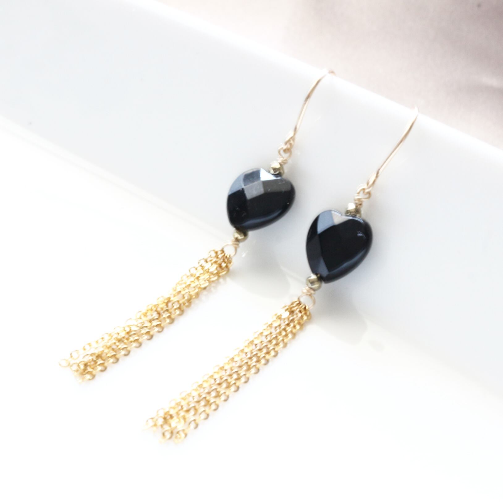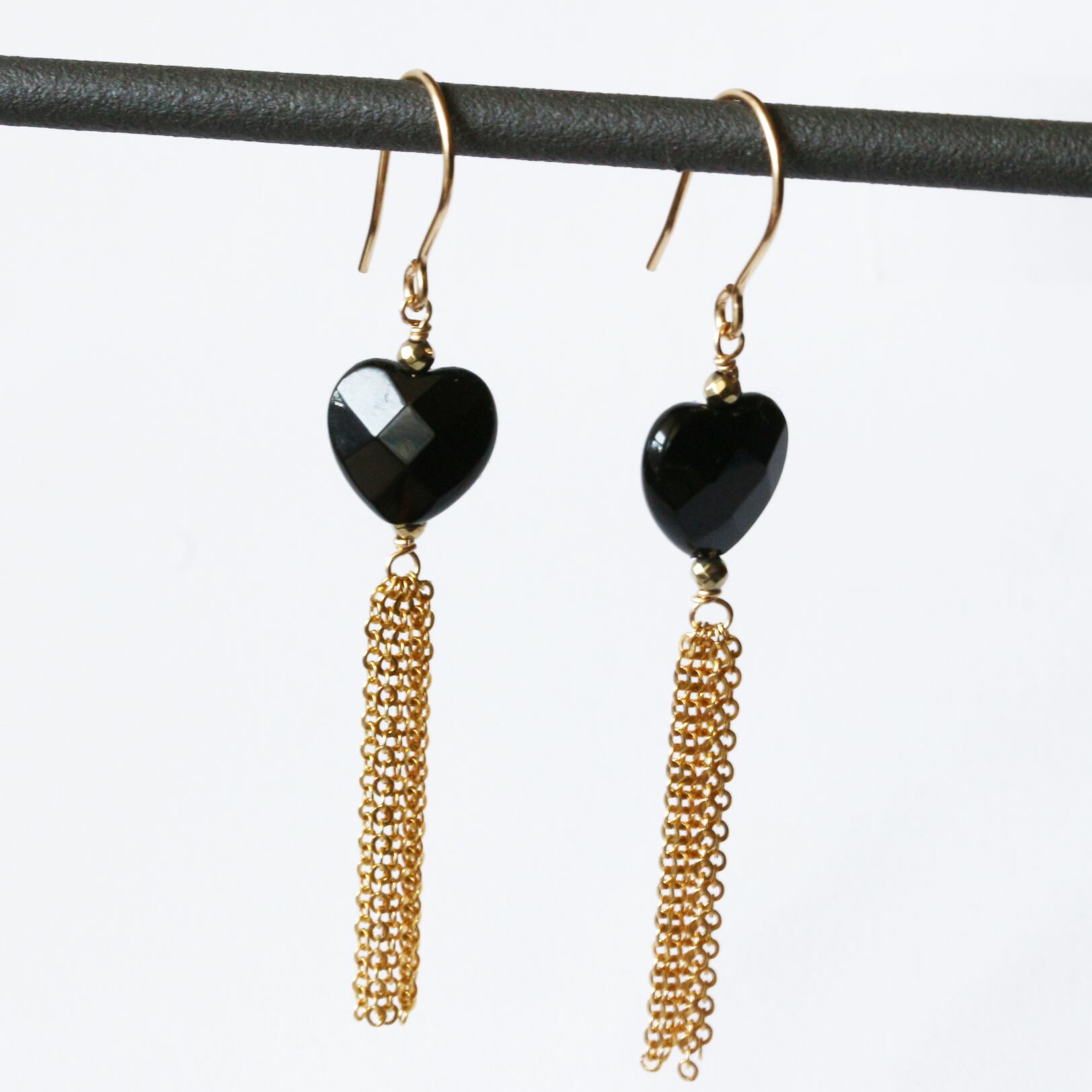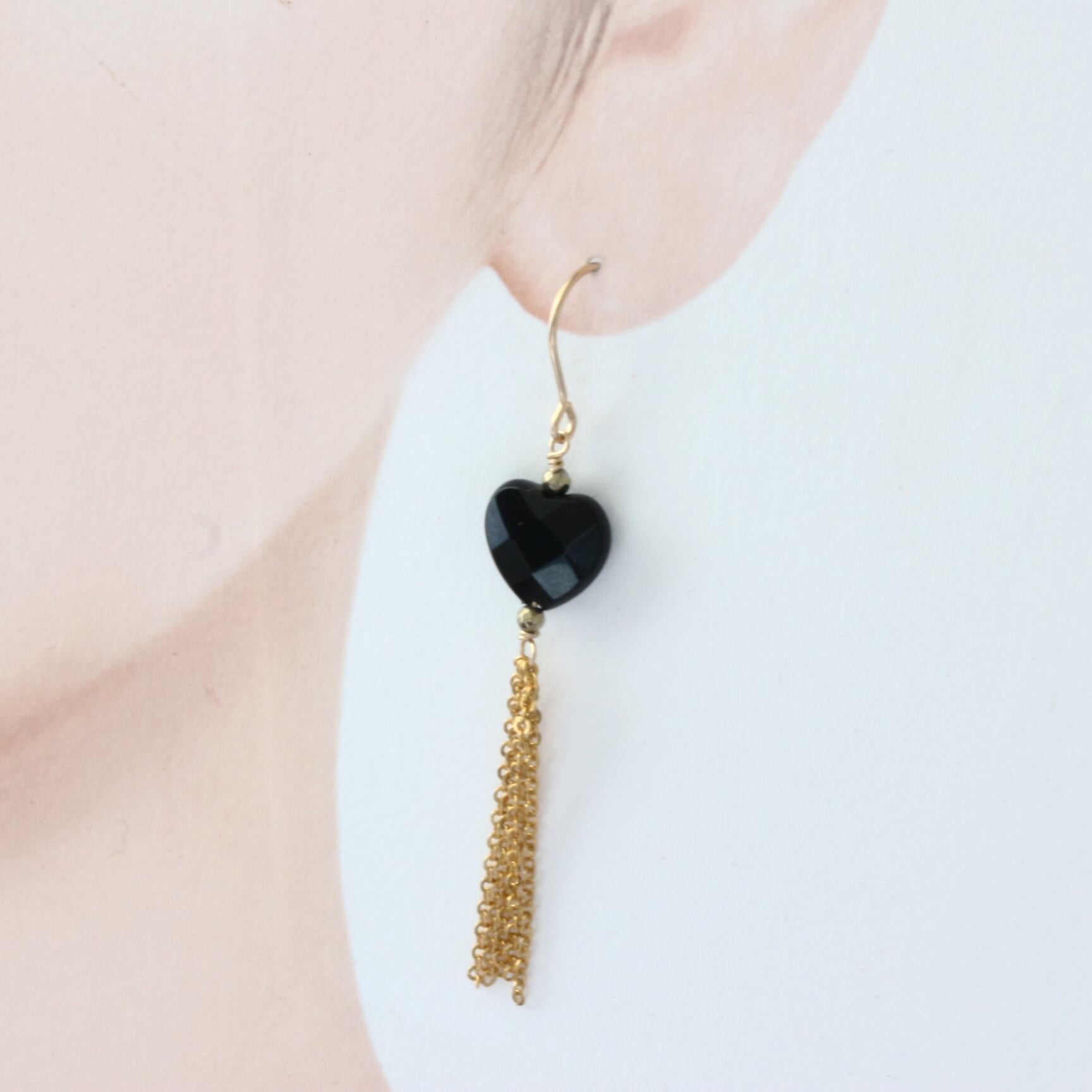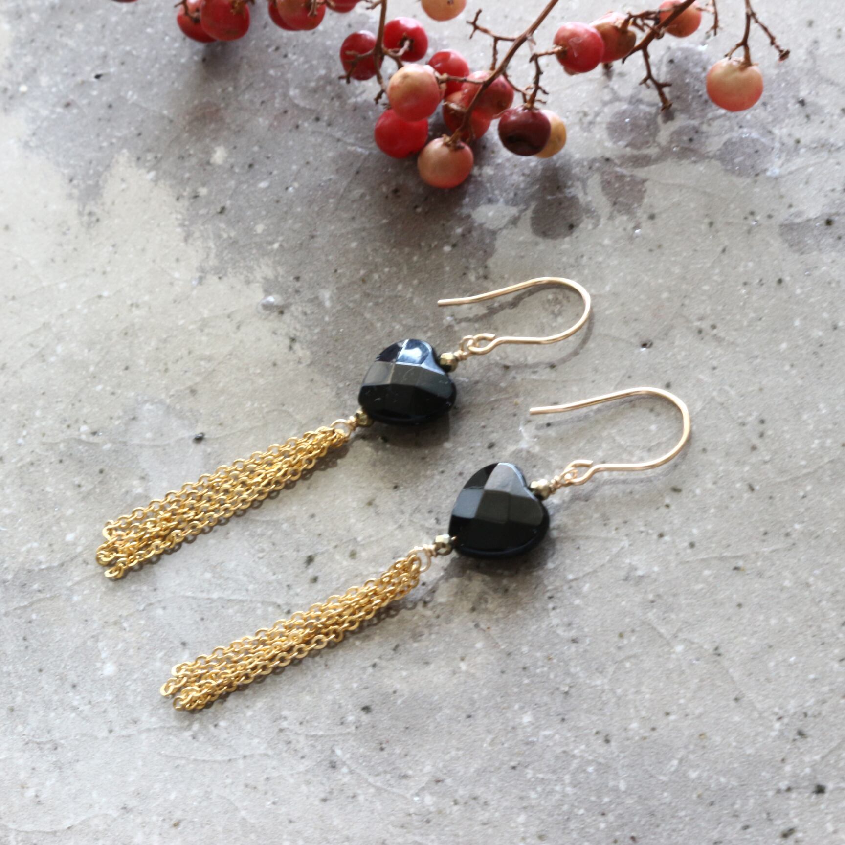 しっとり黒く輝くハートのオニキスに華奢なチェーンを添えて、揺れるセミロングなタッセルピアスに仕立てました。