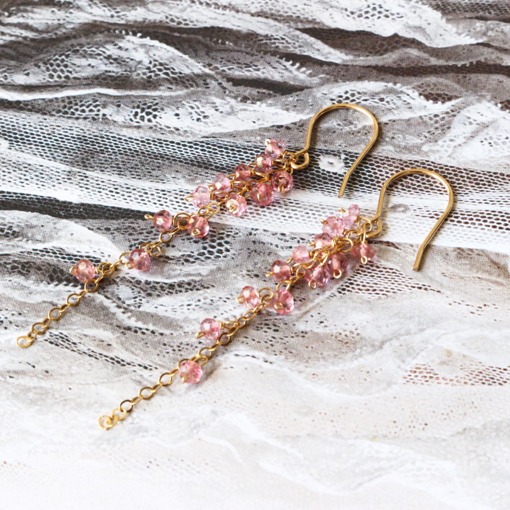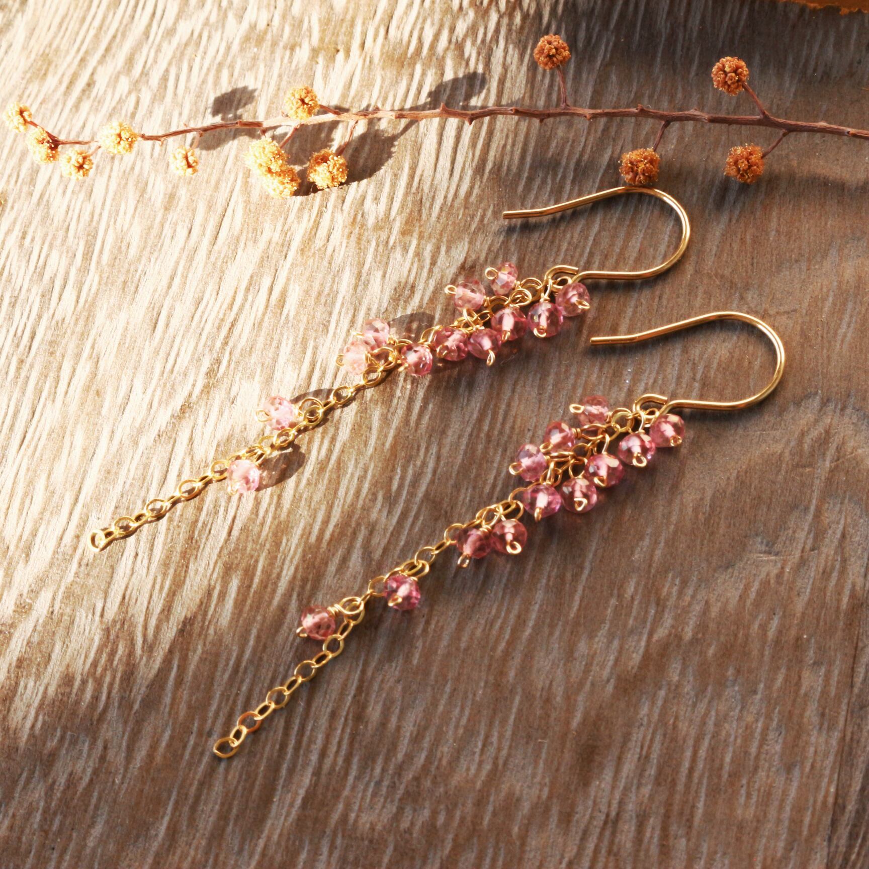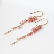 ピンクトパーズの小粒たちが揃って、シャラシャラと華奢なチェーンと共に耳元で輝きます。