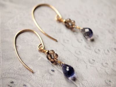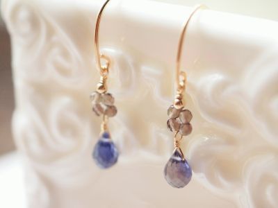 深海や夜空を思わす藍色のアイオライトのドロップカットに、ほんのりブラウンのスモーキークォーツを添えて。