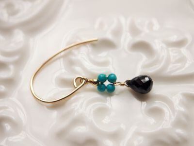 キラリと輝く黒色、ブラックスピネルのドロップカットに、ビビットなターコイズブルーの小粒を添えて。