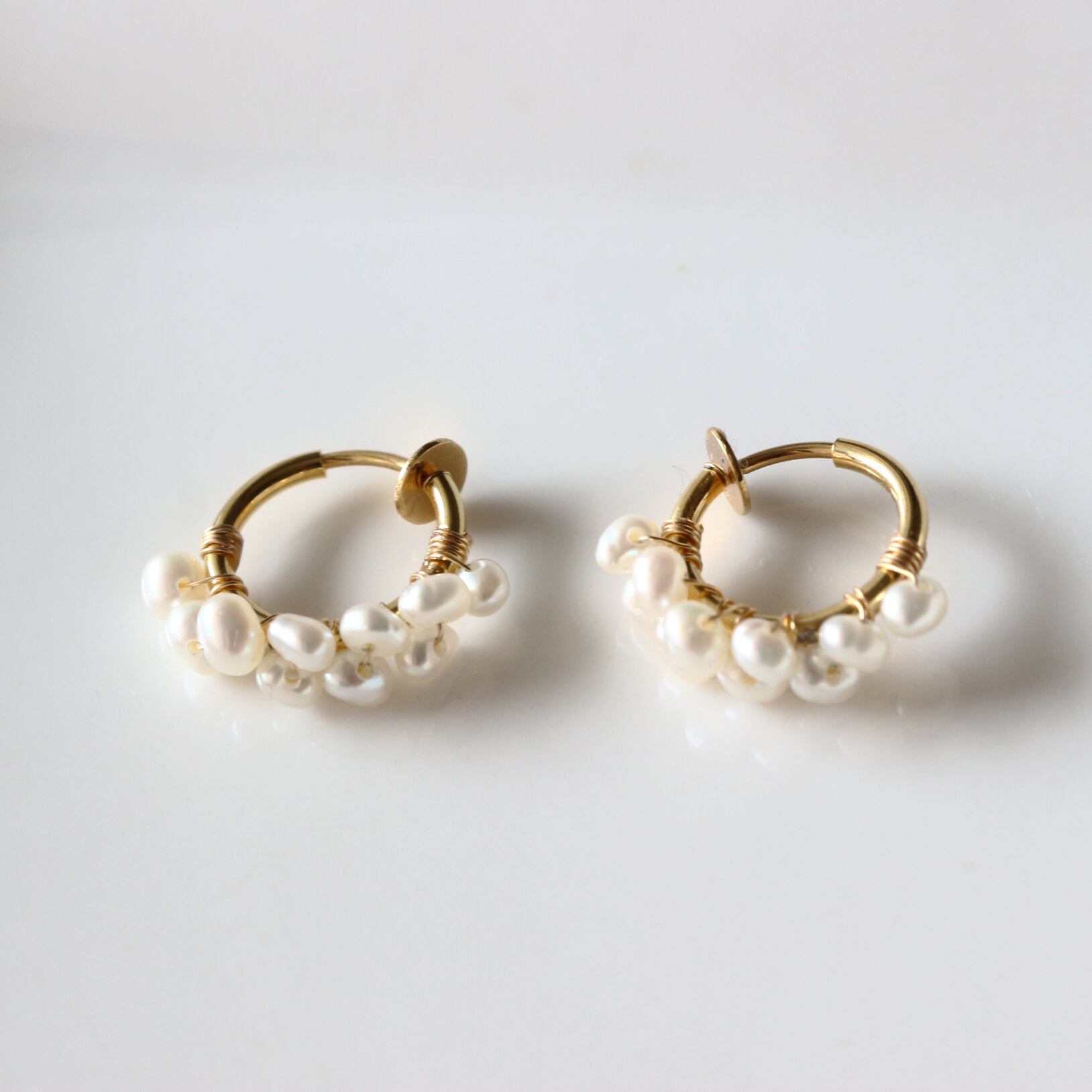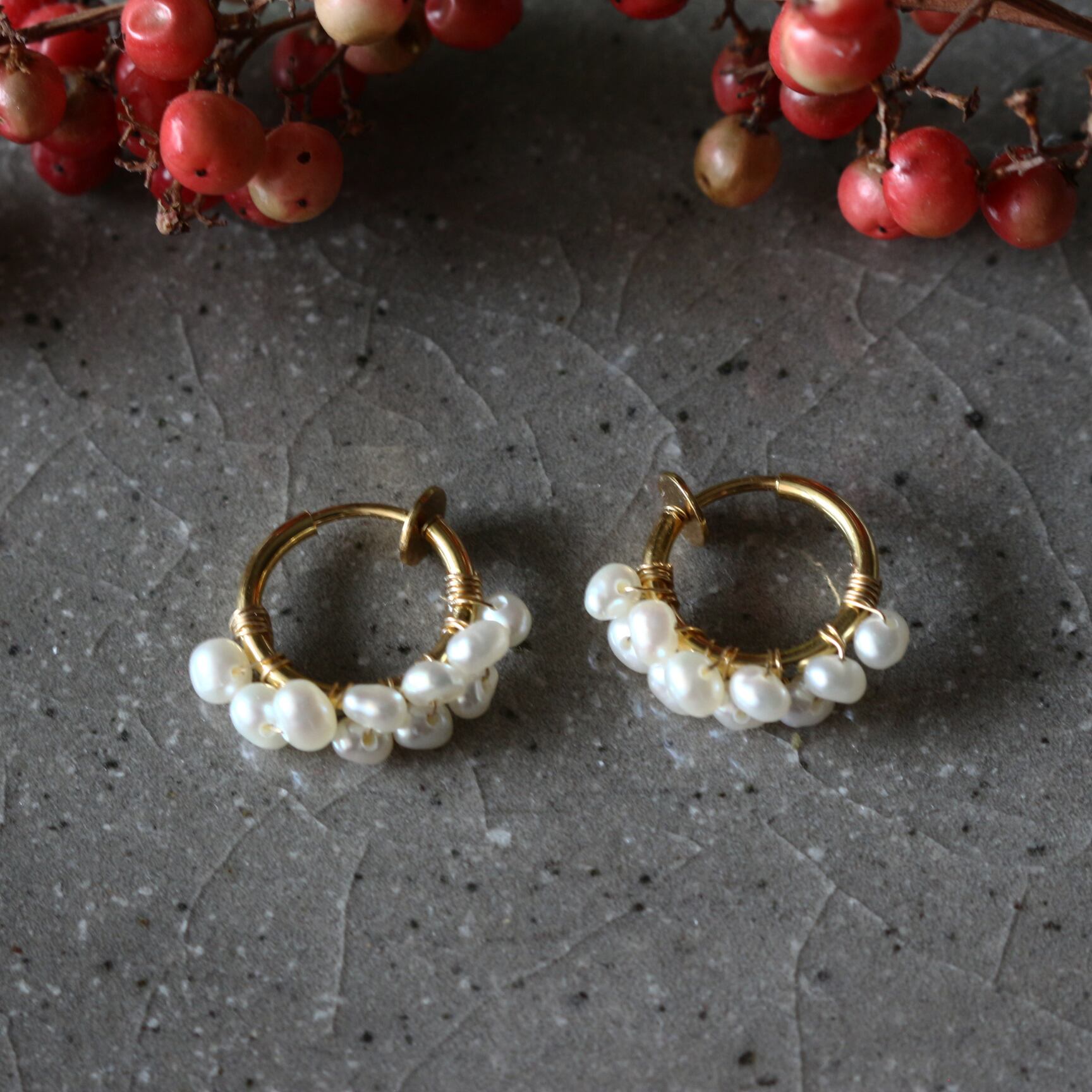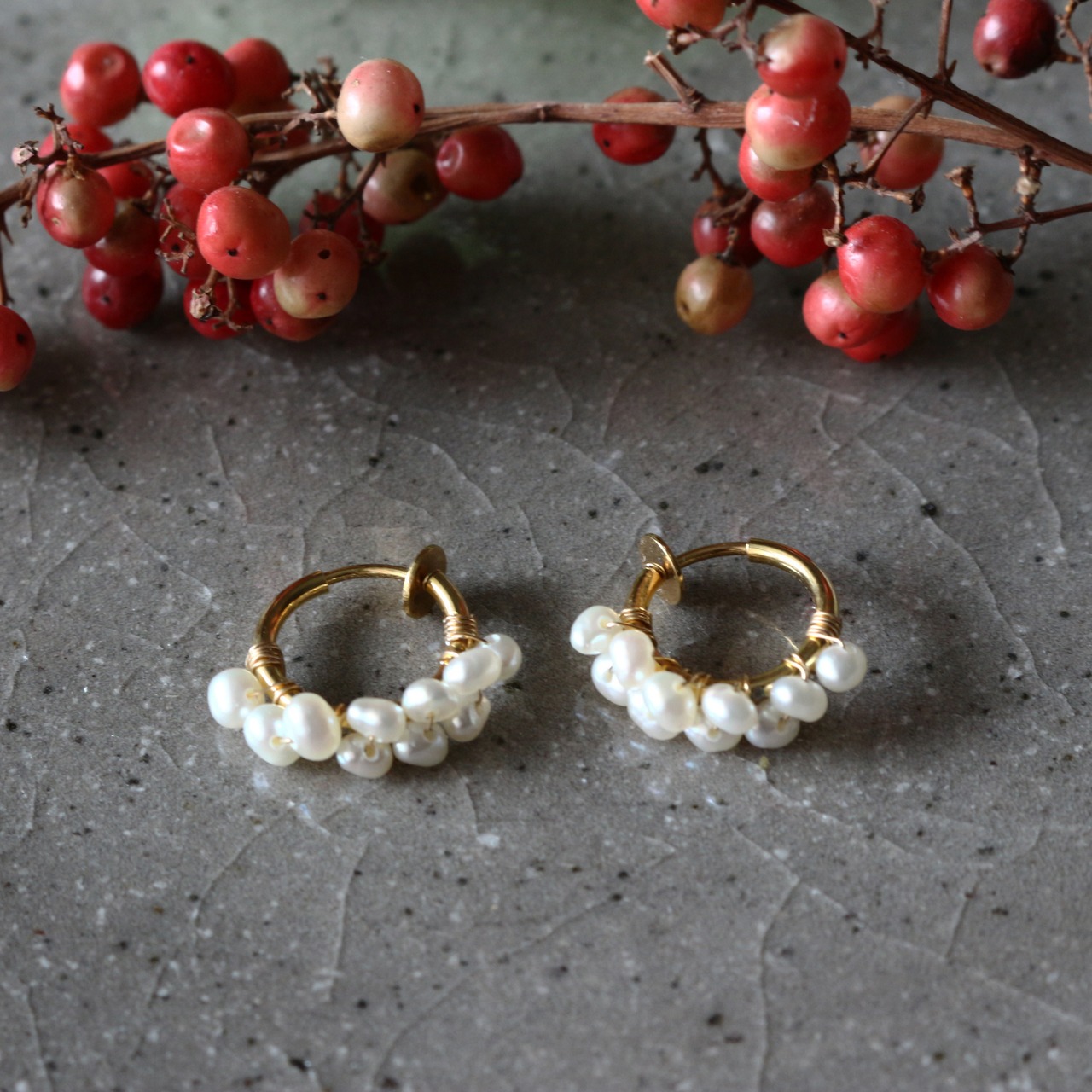 まん丸ではない、「ポテト」と呼ばれる少し歪で小さくて可愛らしい淡水パールたちをギュッと集め、フープイヤリングに仕立てました。