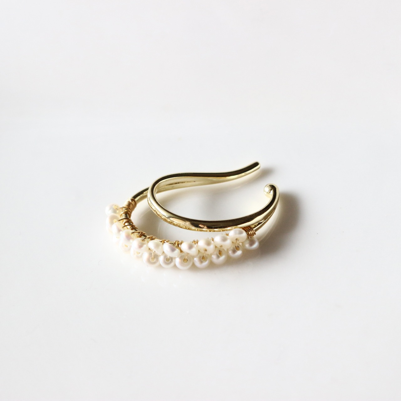 ダブルループのイヤーカフに希少な極小ベビーパールをギュッと巻きつた、普段使いはもちろんお出かけにもぴったり!アクセントとして活用して頂けそうです。