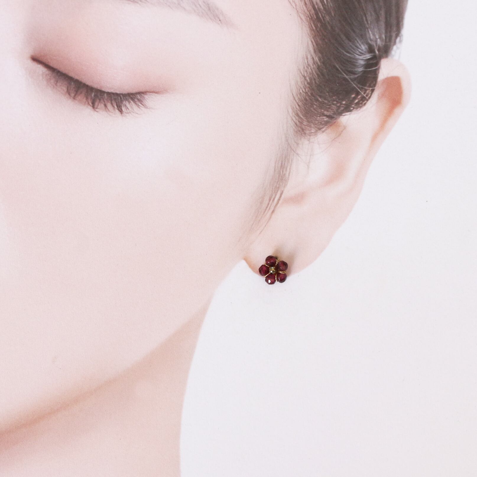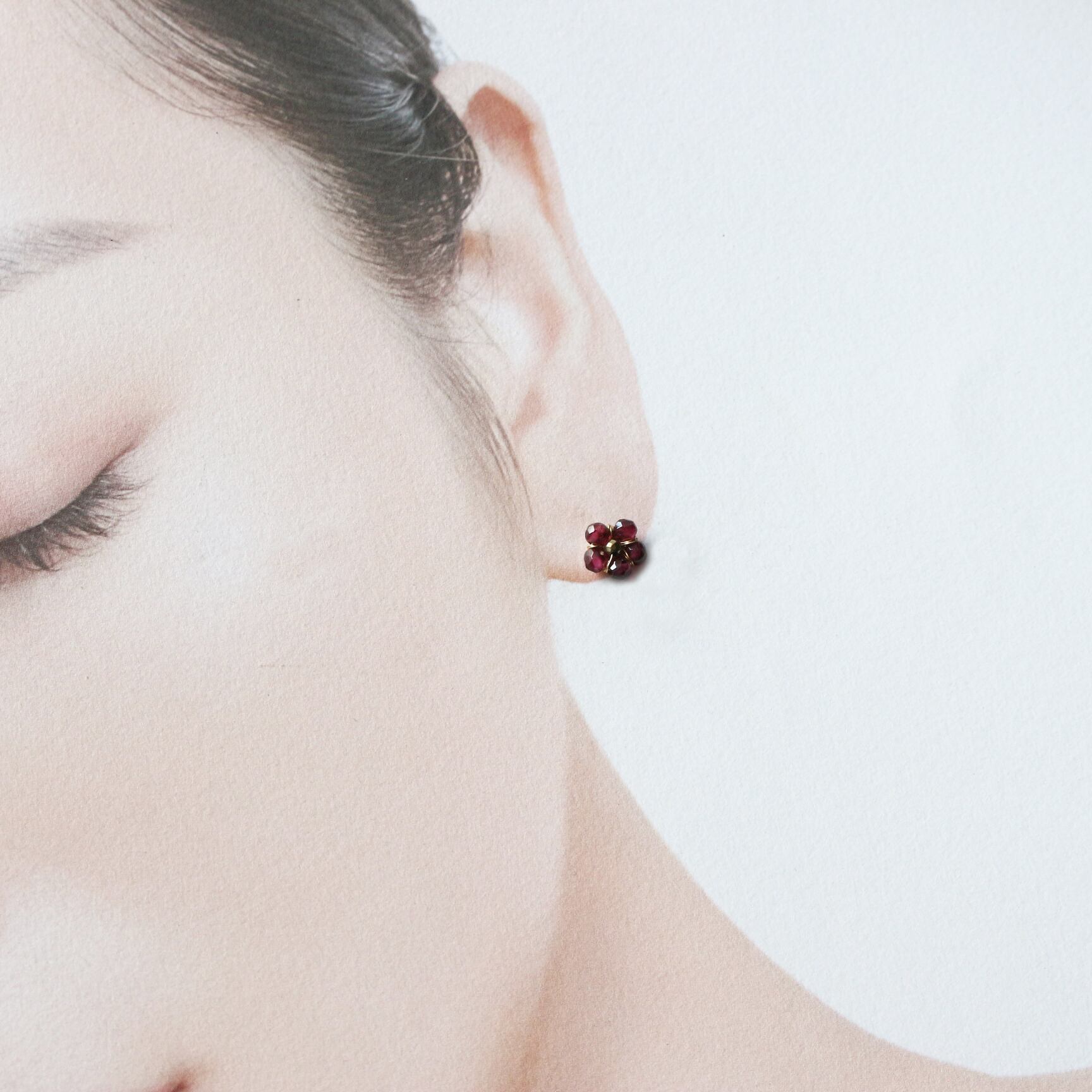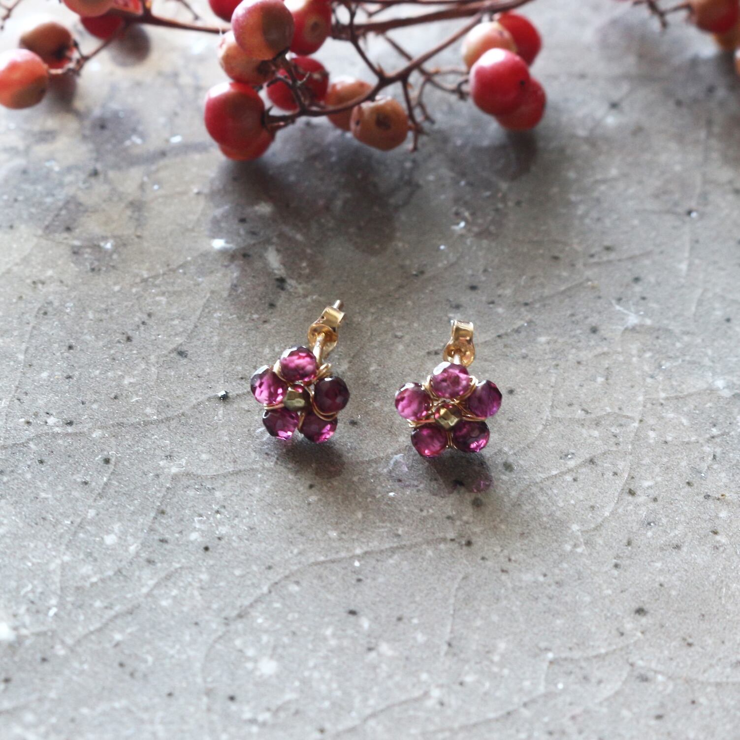 別名「ざくろ石」と呼ばれ、その名の通り深い赤色のイメージが強いガーネットですが、他にも色のバリエーションがあり今回はワイン色の紫色がかった「ロードライトガーネット」の小粒をギュッと集めて小花モチーフに。