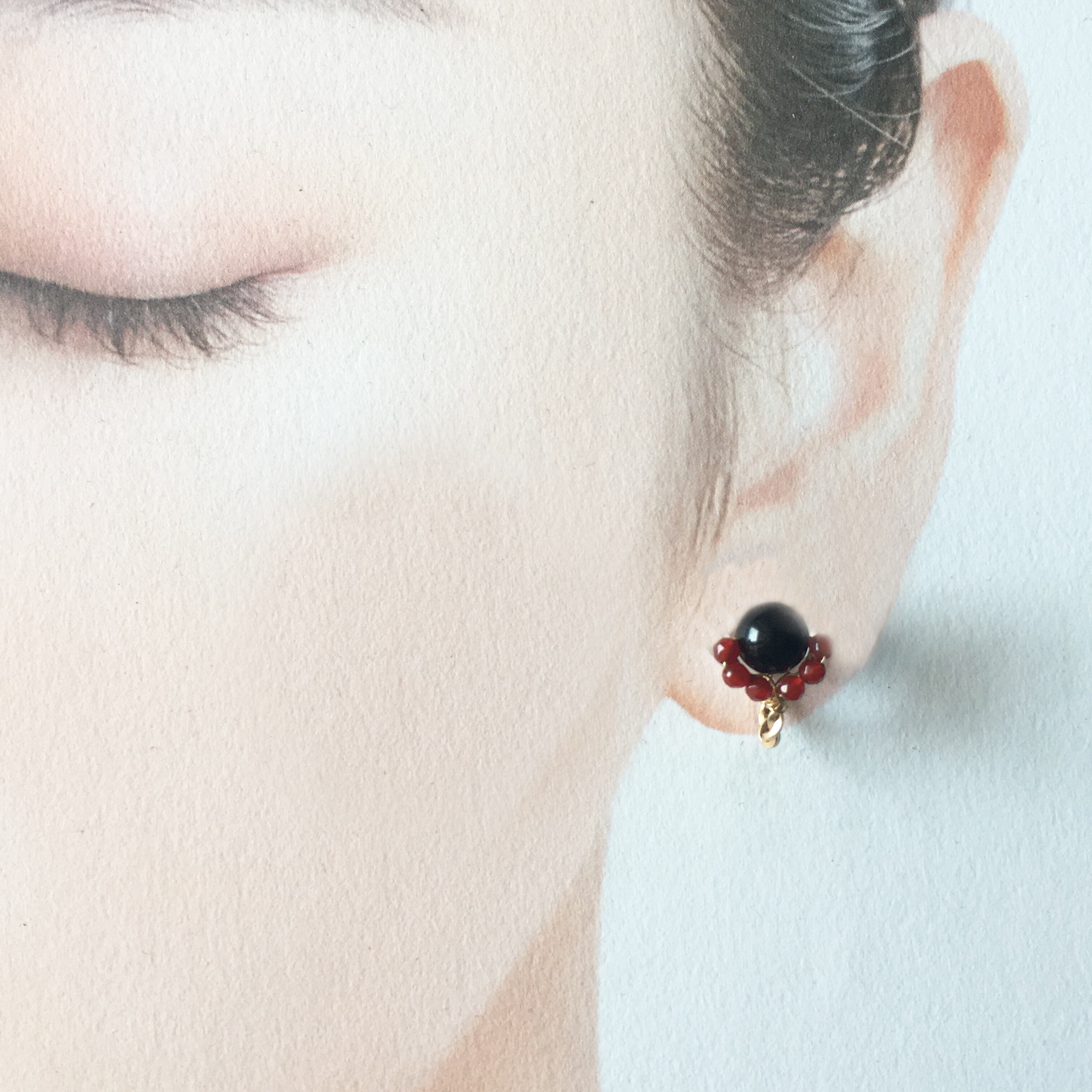 艶めく、つるんとしたまん丸オニキスの周りに、落ち着いた赤色が美しいレッドアゲート、小さいながらも目を引く組み合わせです。