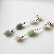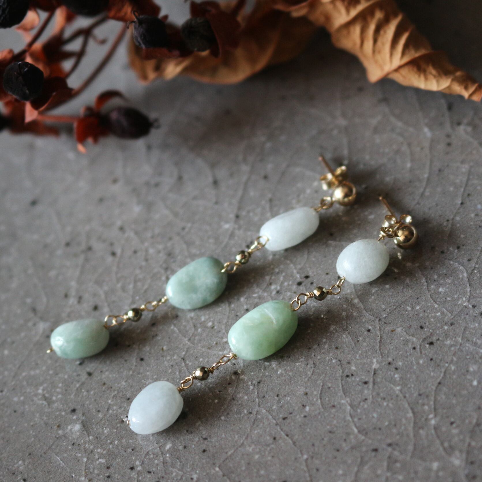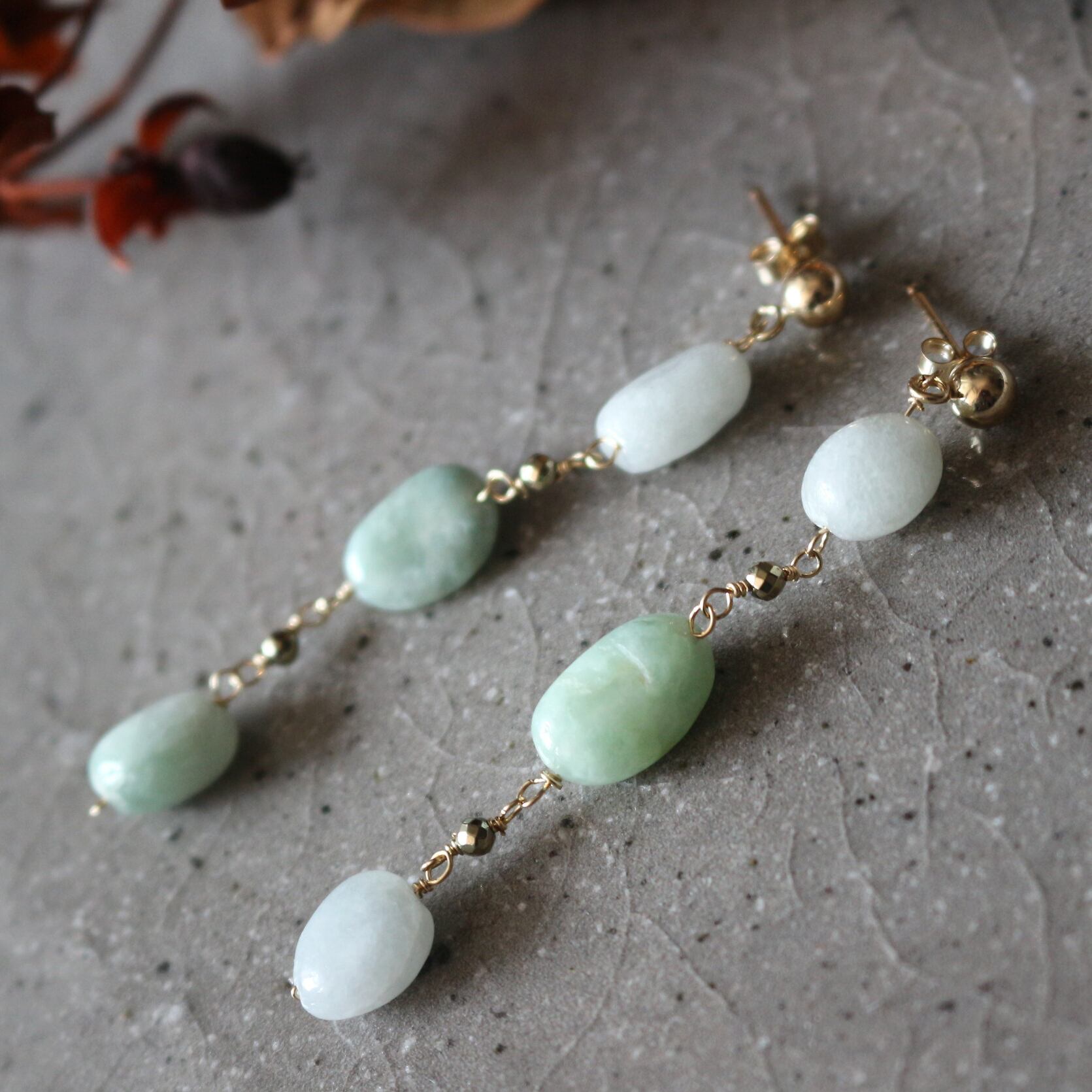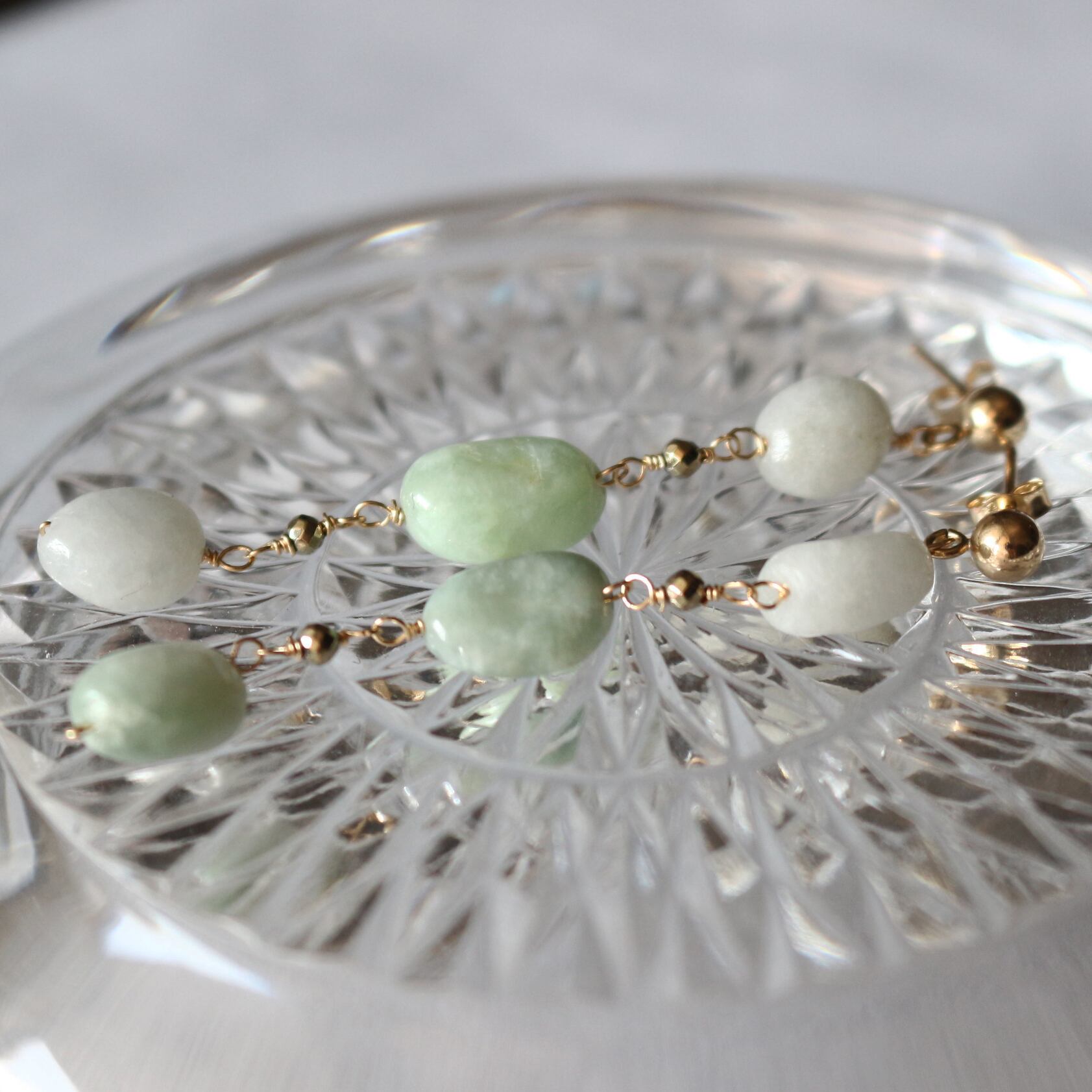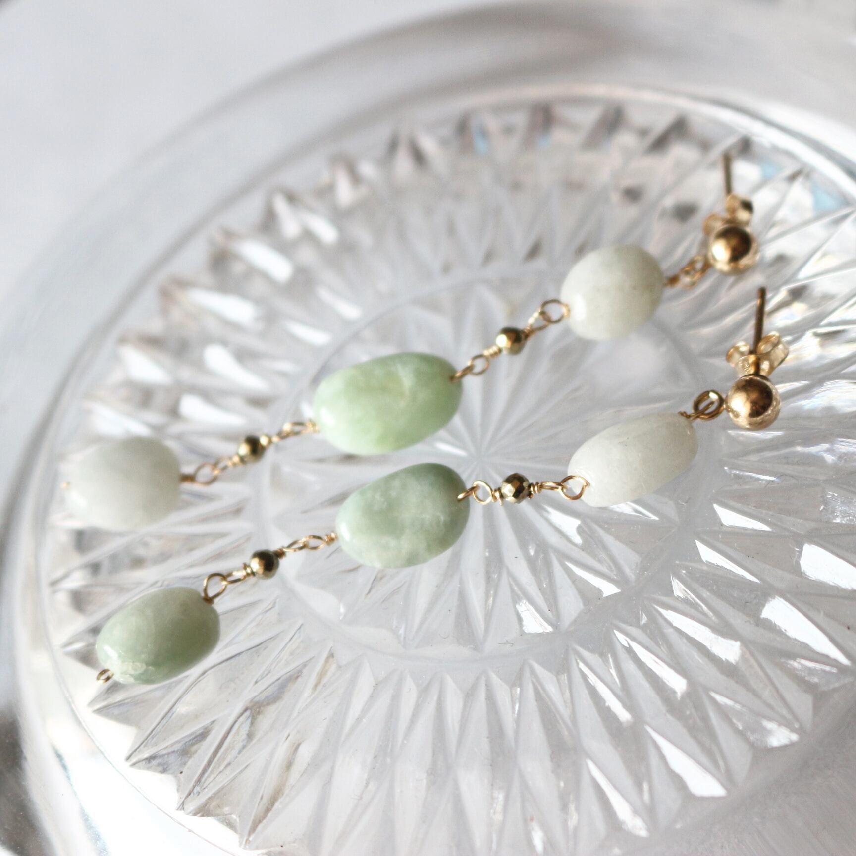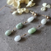 優しい色合いが美しいミルキーグリーンのヒスイ(ビルマ産)が連なったセミロングピアスです。