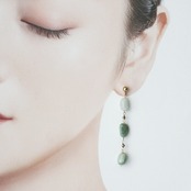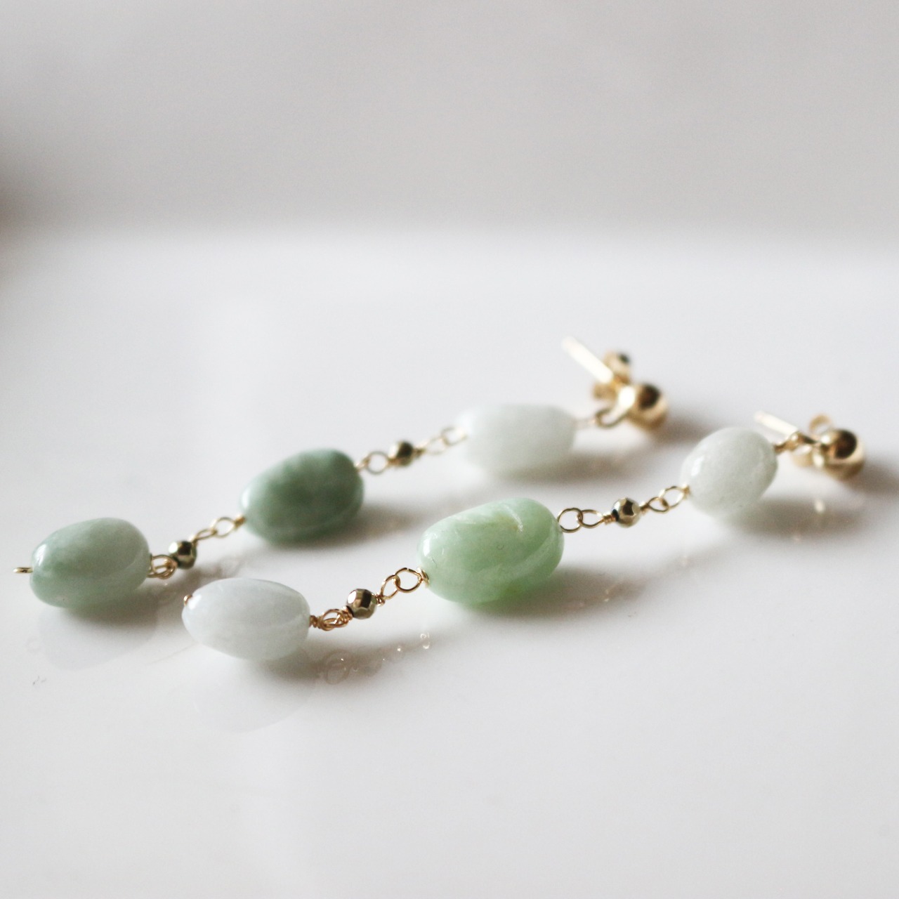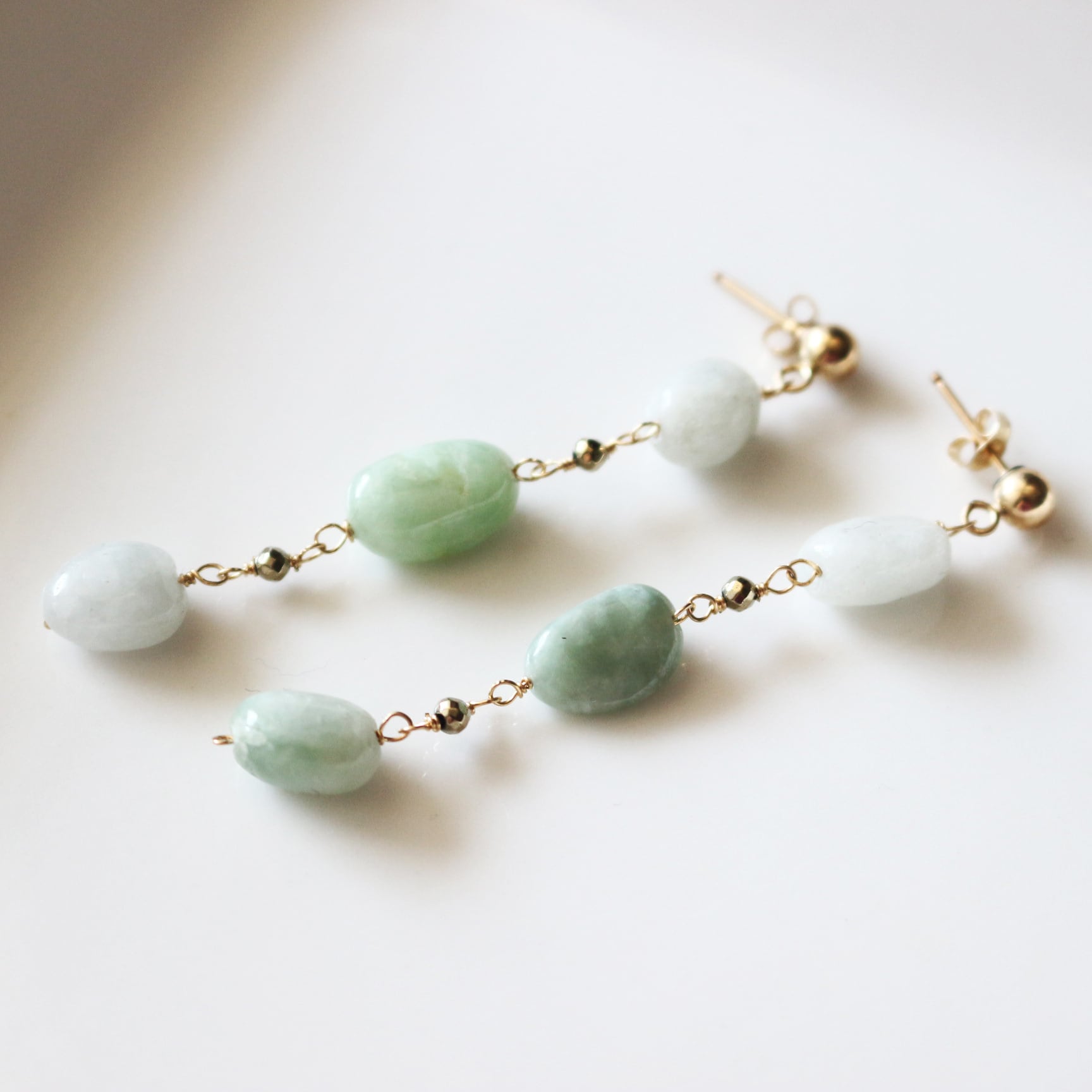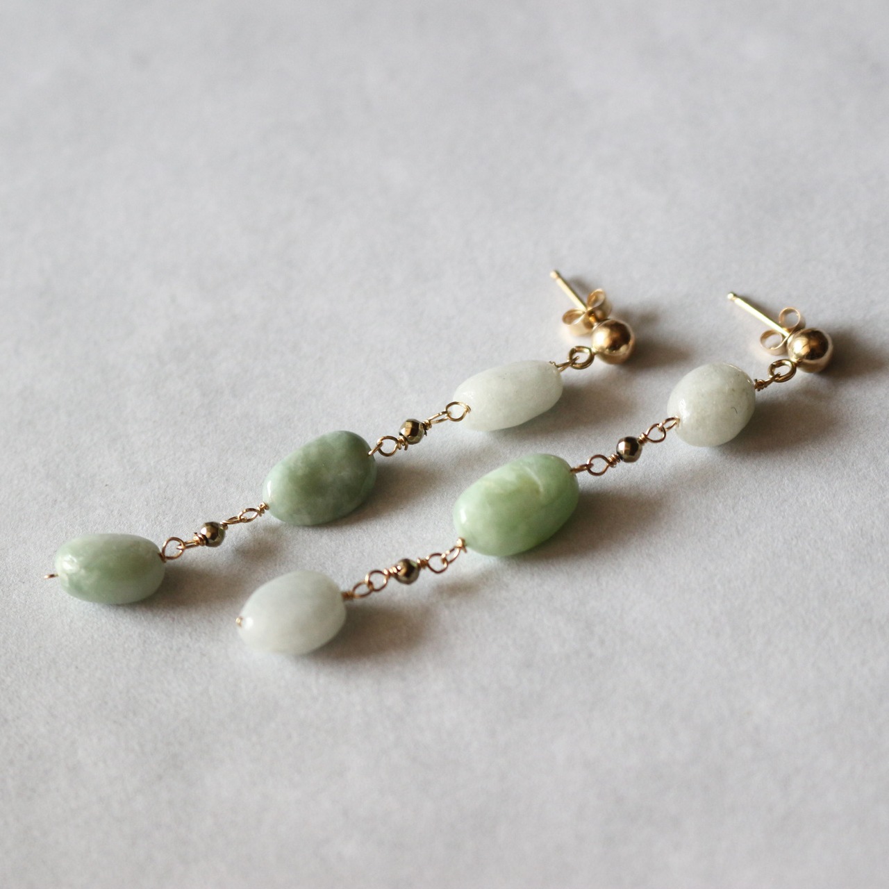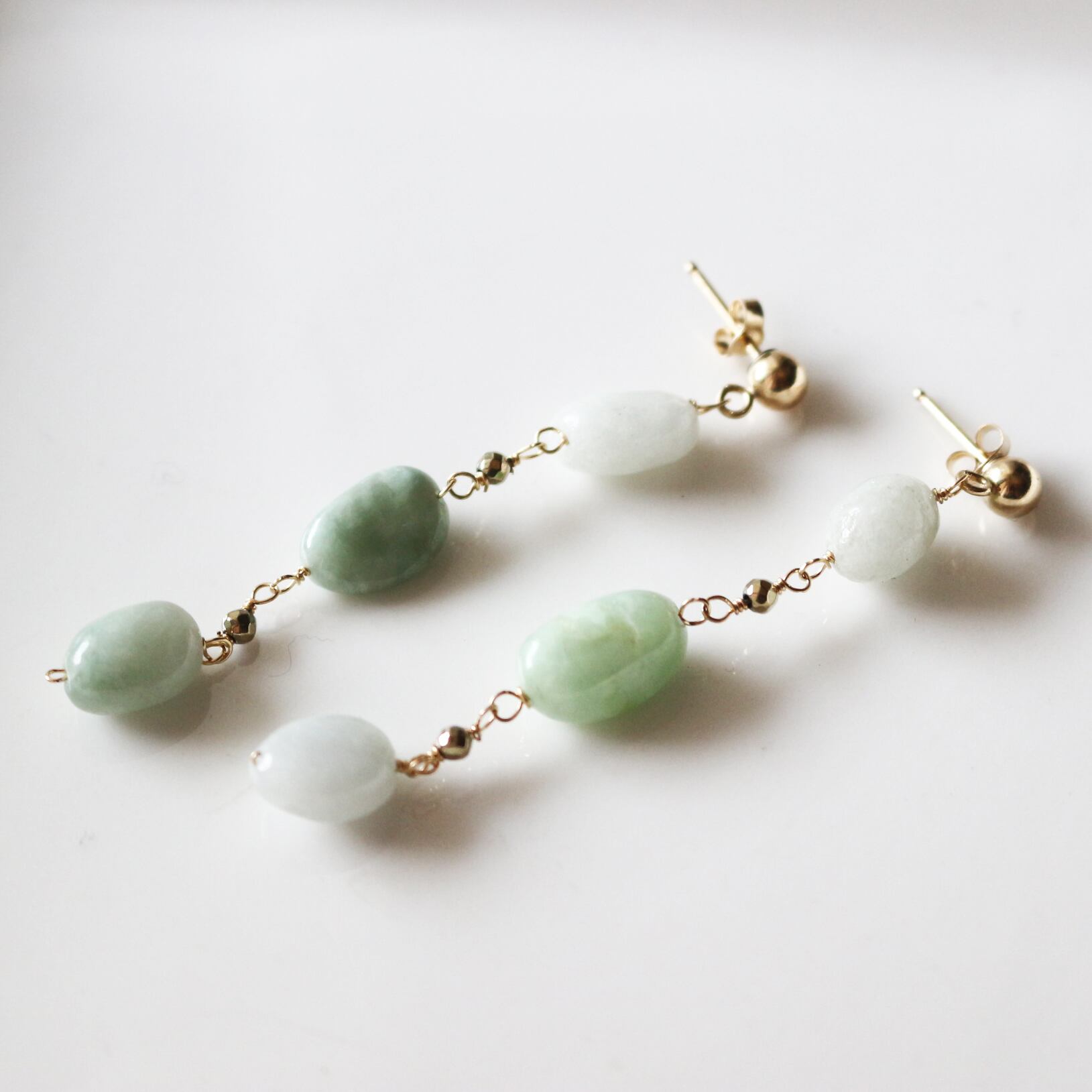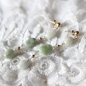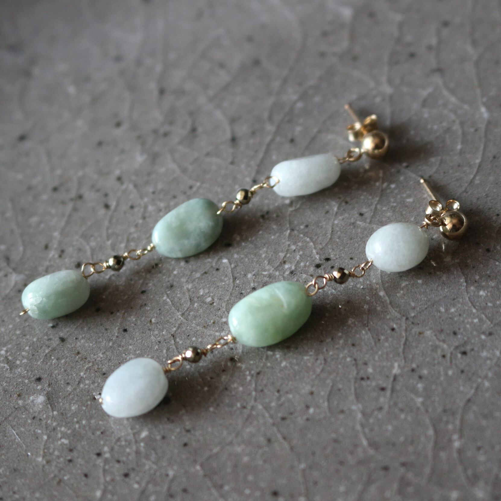 優しい色合いが美しいミルキーグリーンのヒスイ(ビルマ産)が連なったセミロングピアスです。