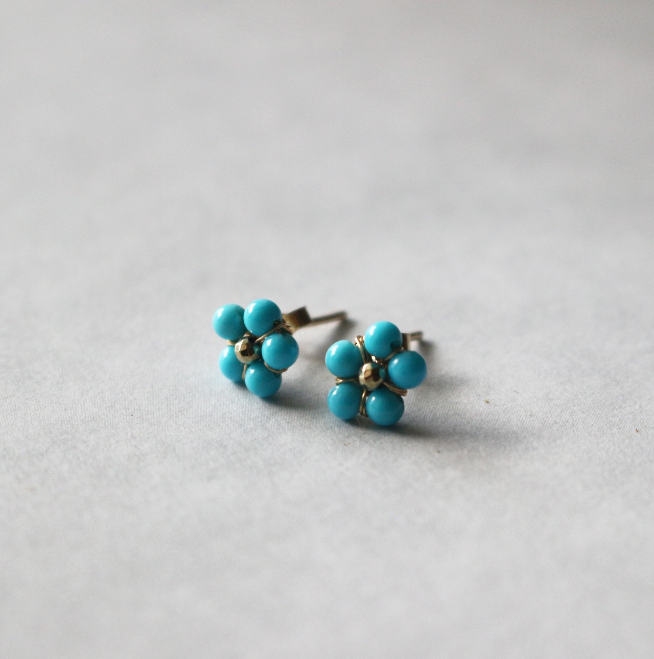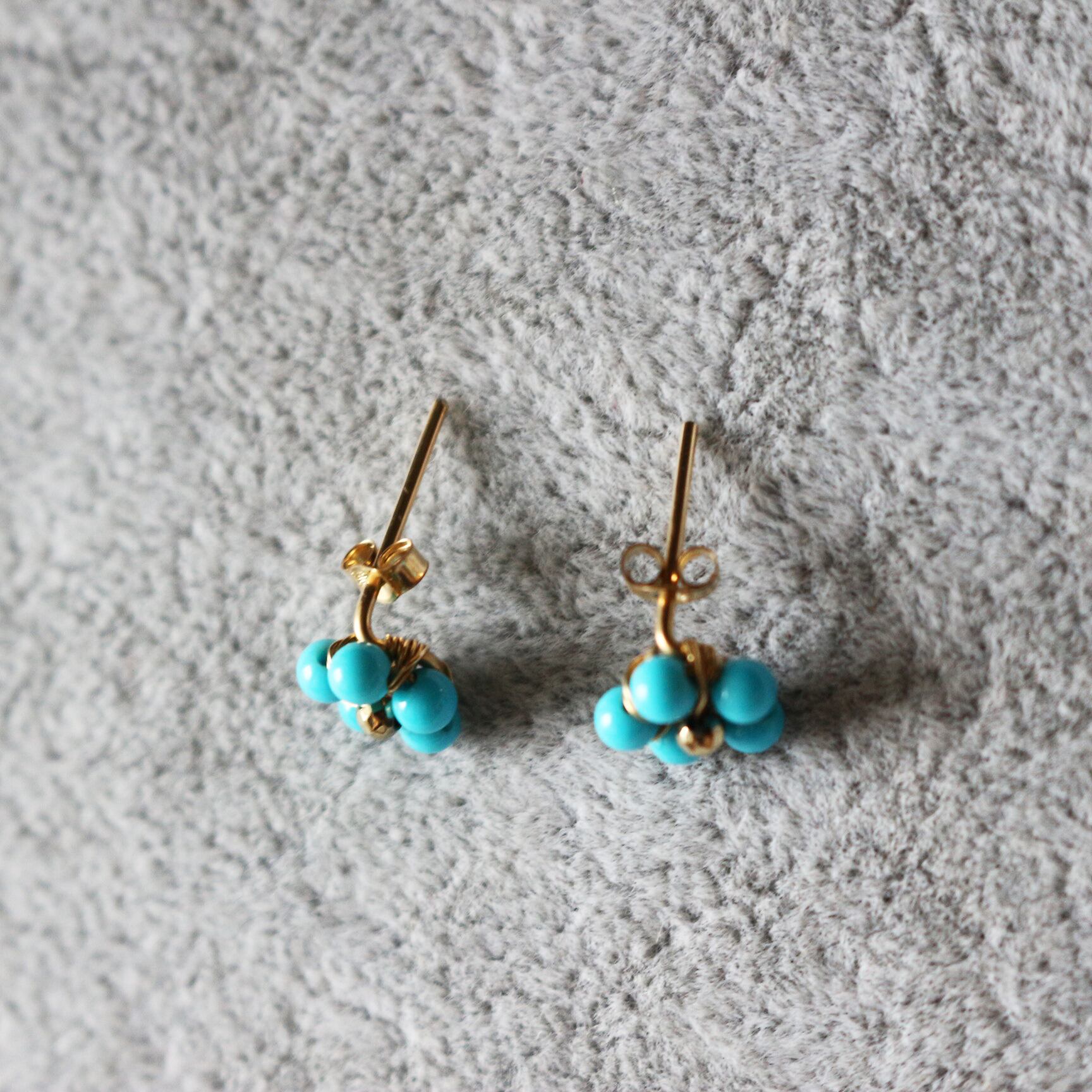 つるんとした発色の良いターコイズの小粒をギュッと集めて小花モチーフに。