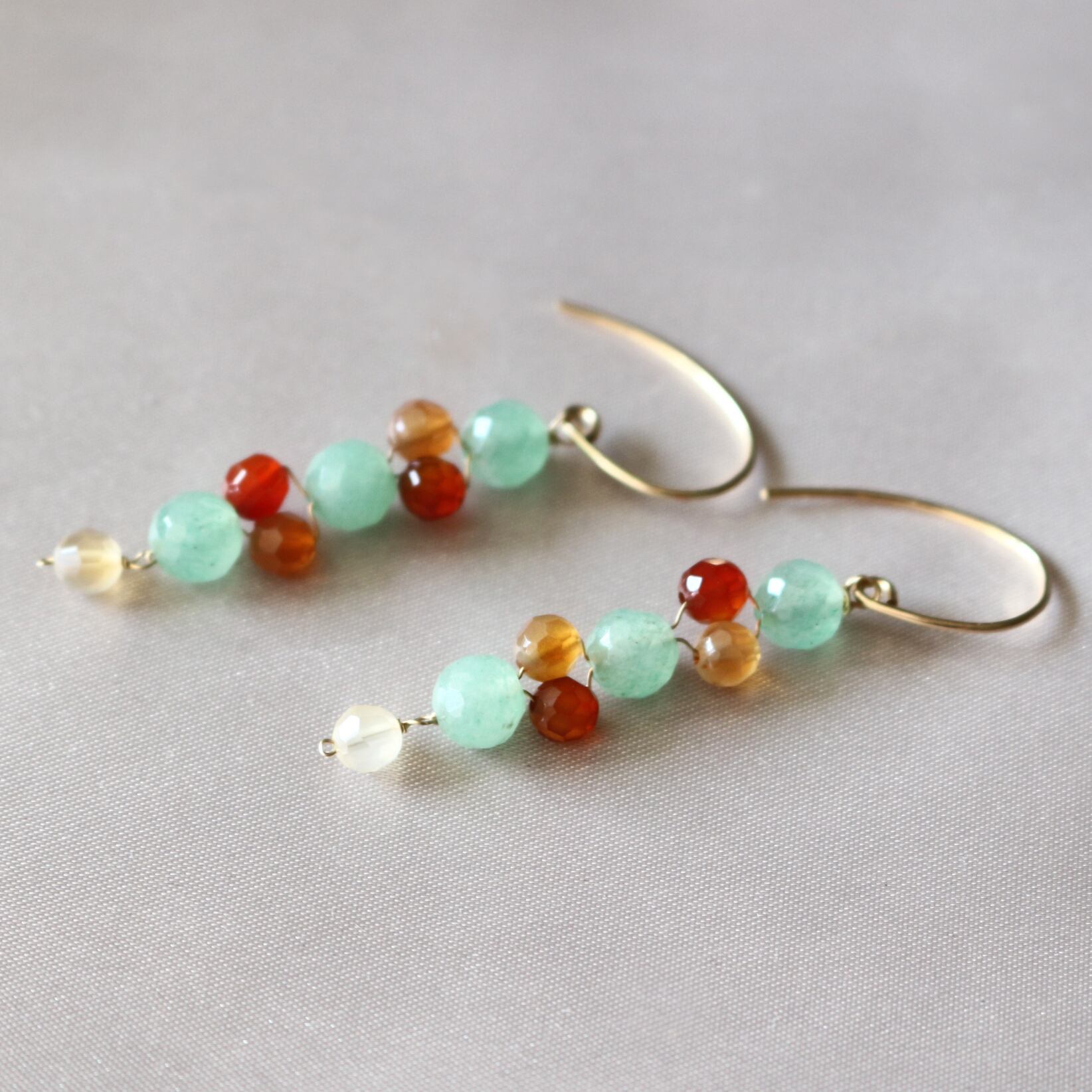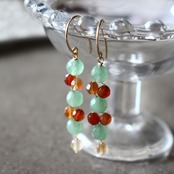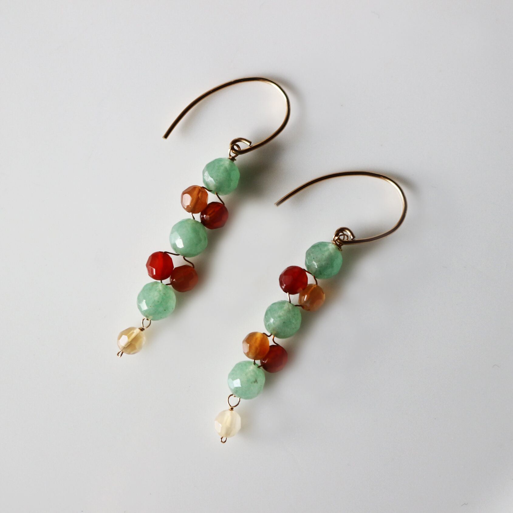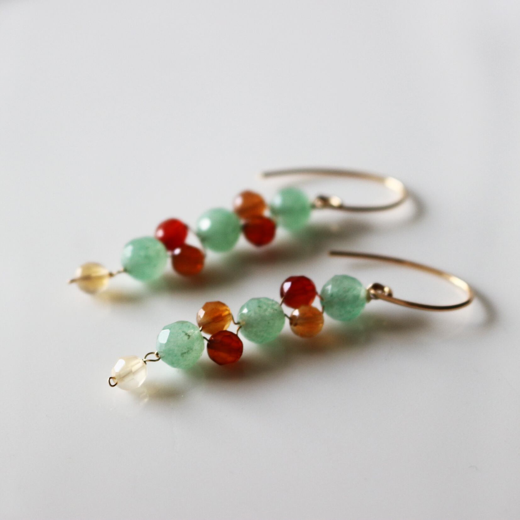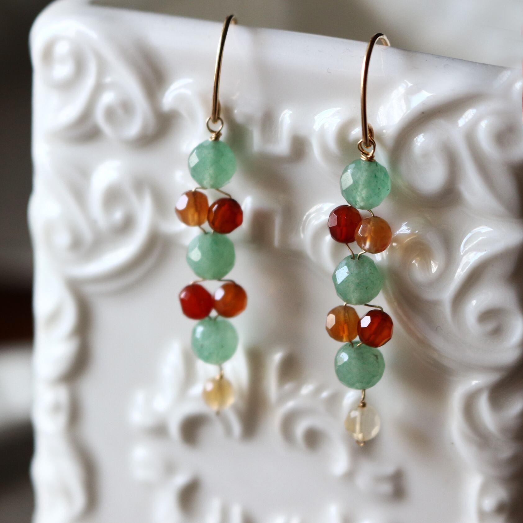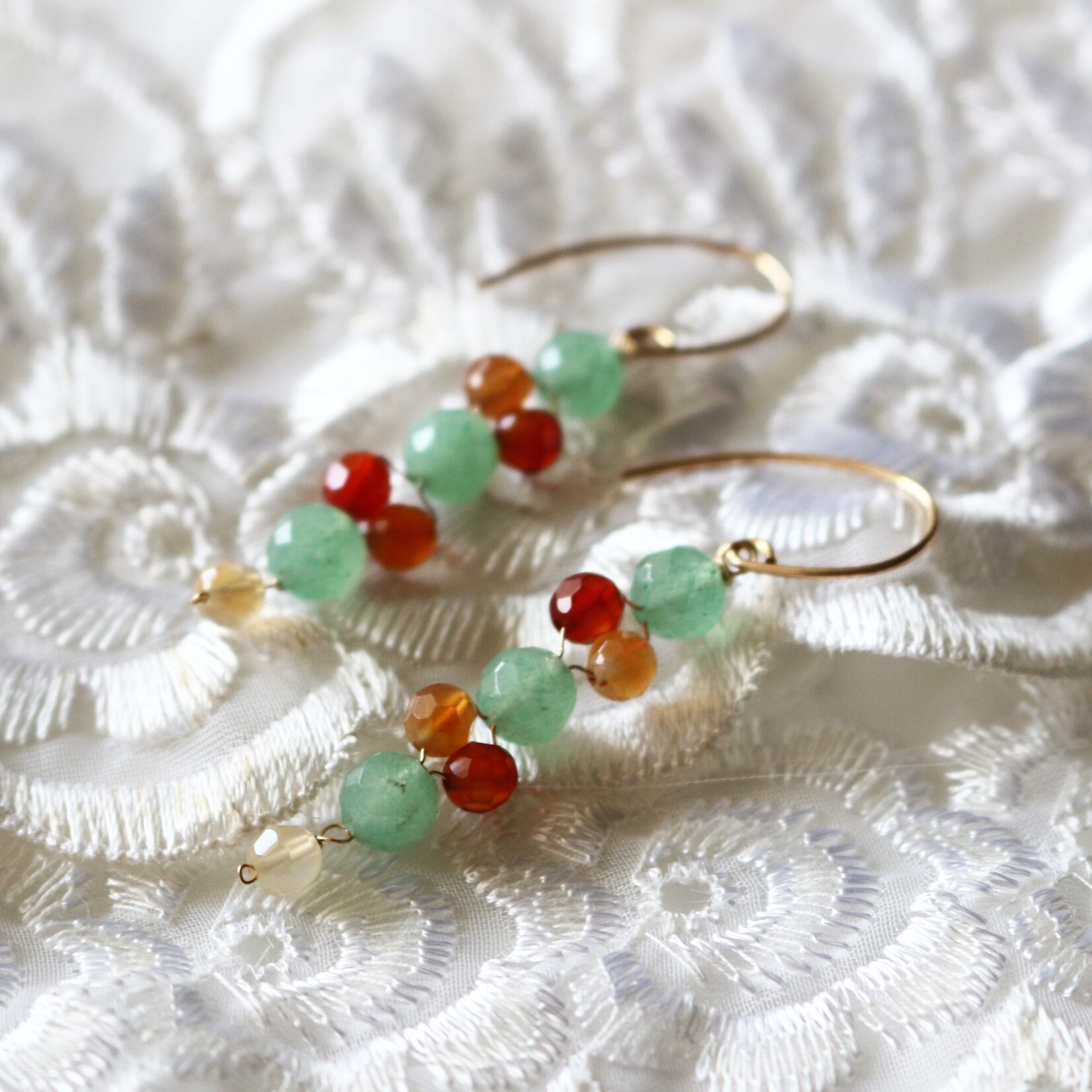 乳白色の優しい緑色のアベンチュリン、秋の実のようなレッドアゲートのコロンとしたラウンドカットの天然石を繋げ、耳元で揺れるデザインとなっております。