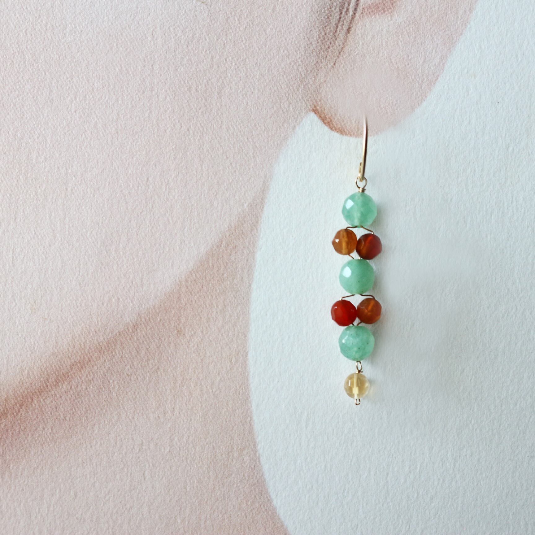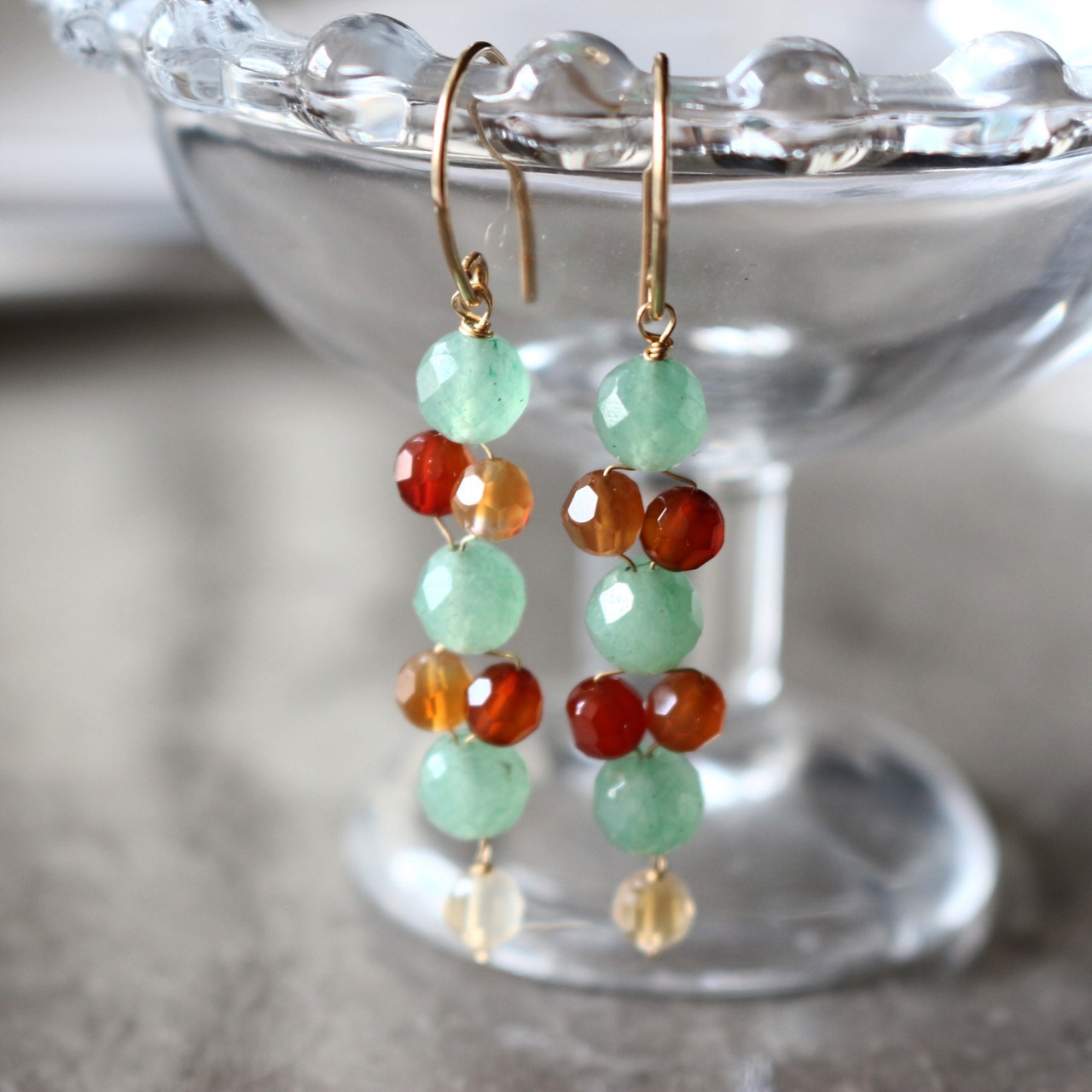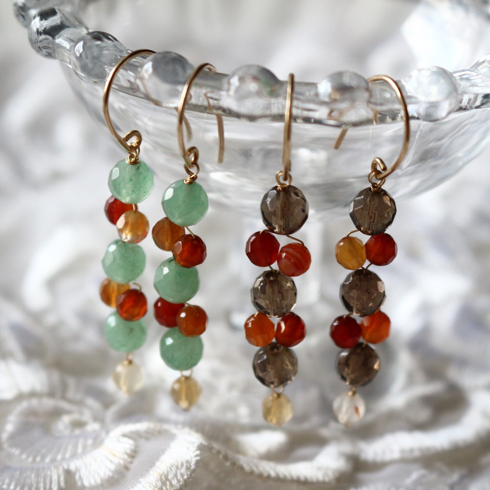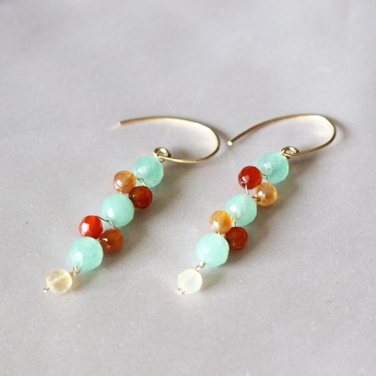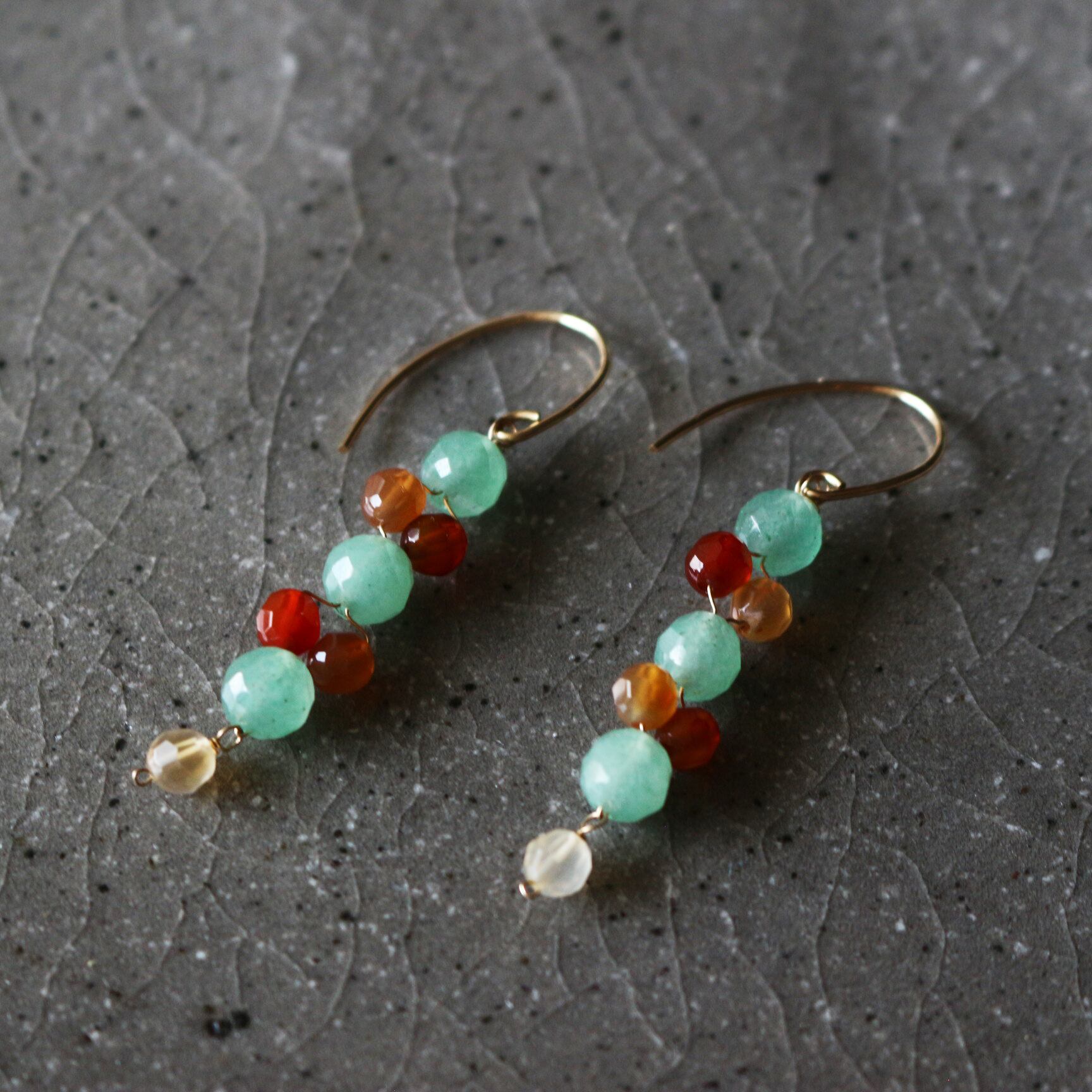 乳白色の優しい緑色のアベンチュリン、秋の実のようなレッドアゲートのコロンとしたラウンドカットの天然石を繋げ、耳元で揺れるデザインとなっております。