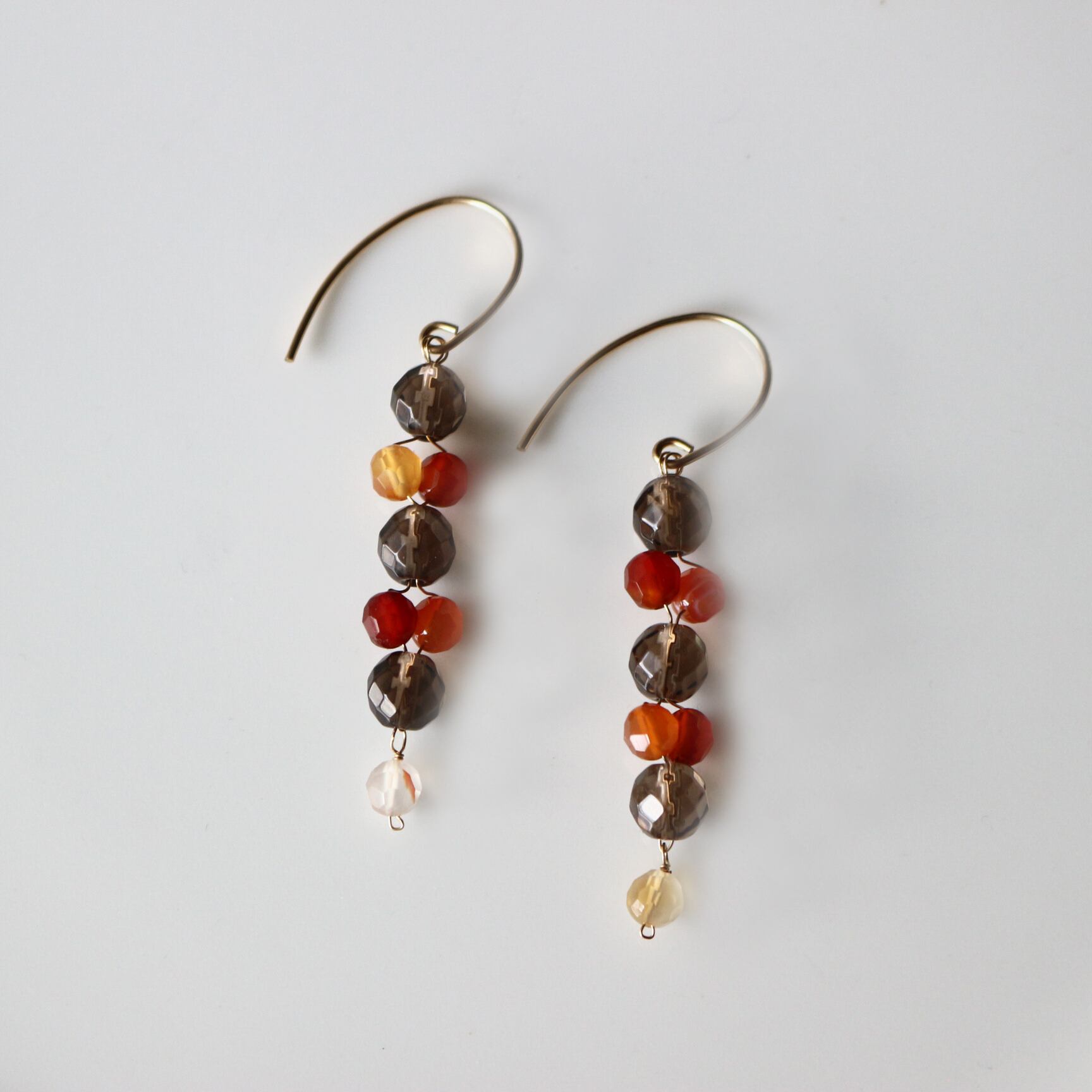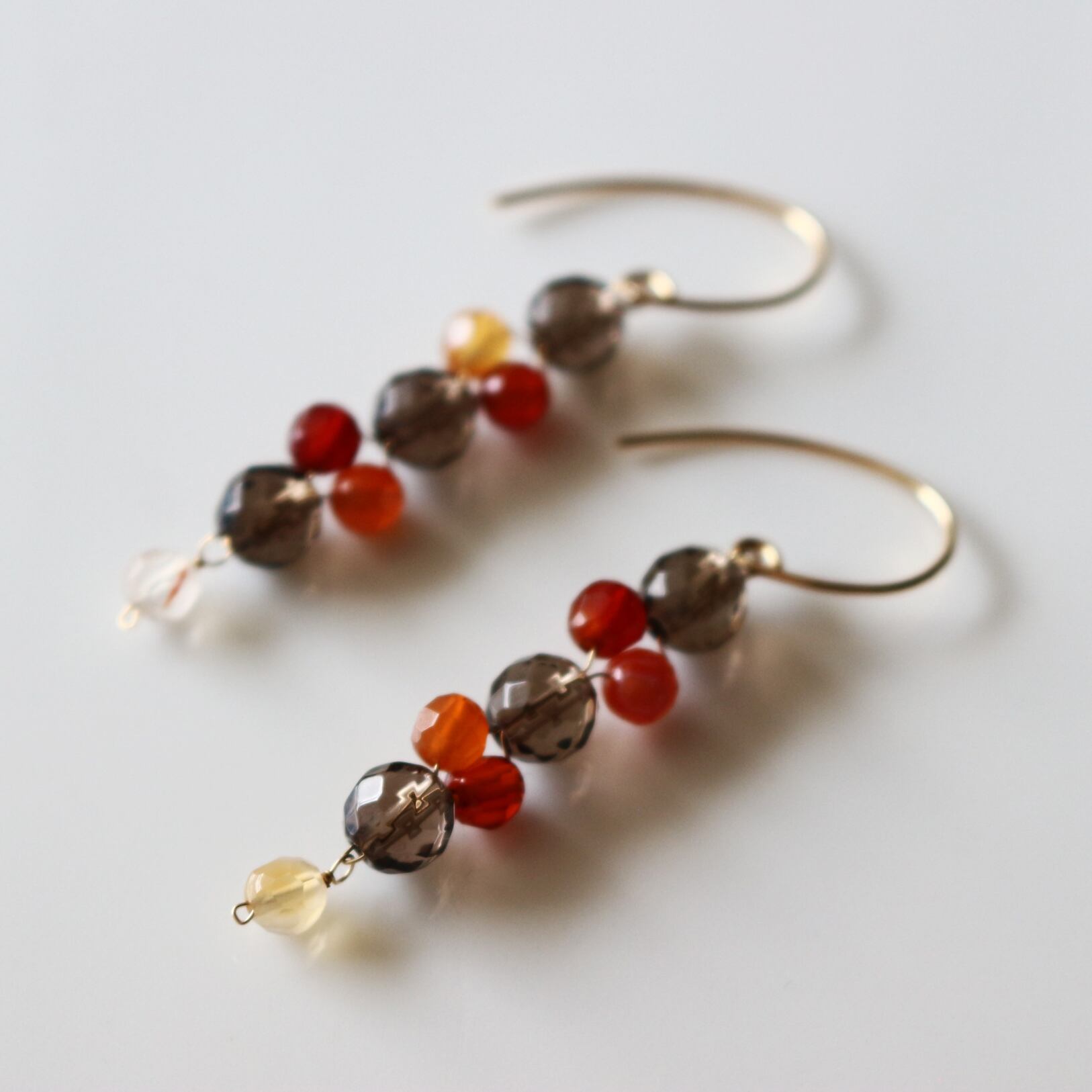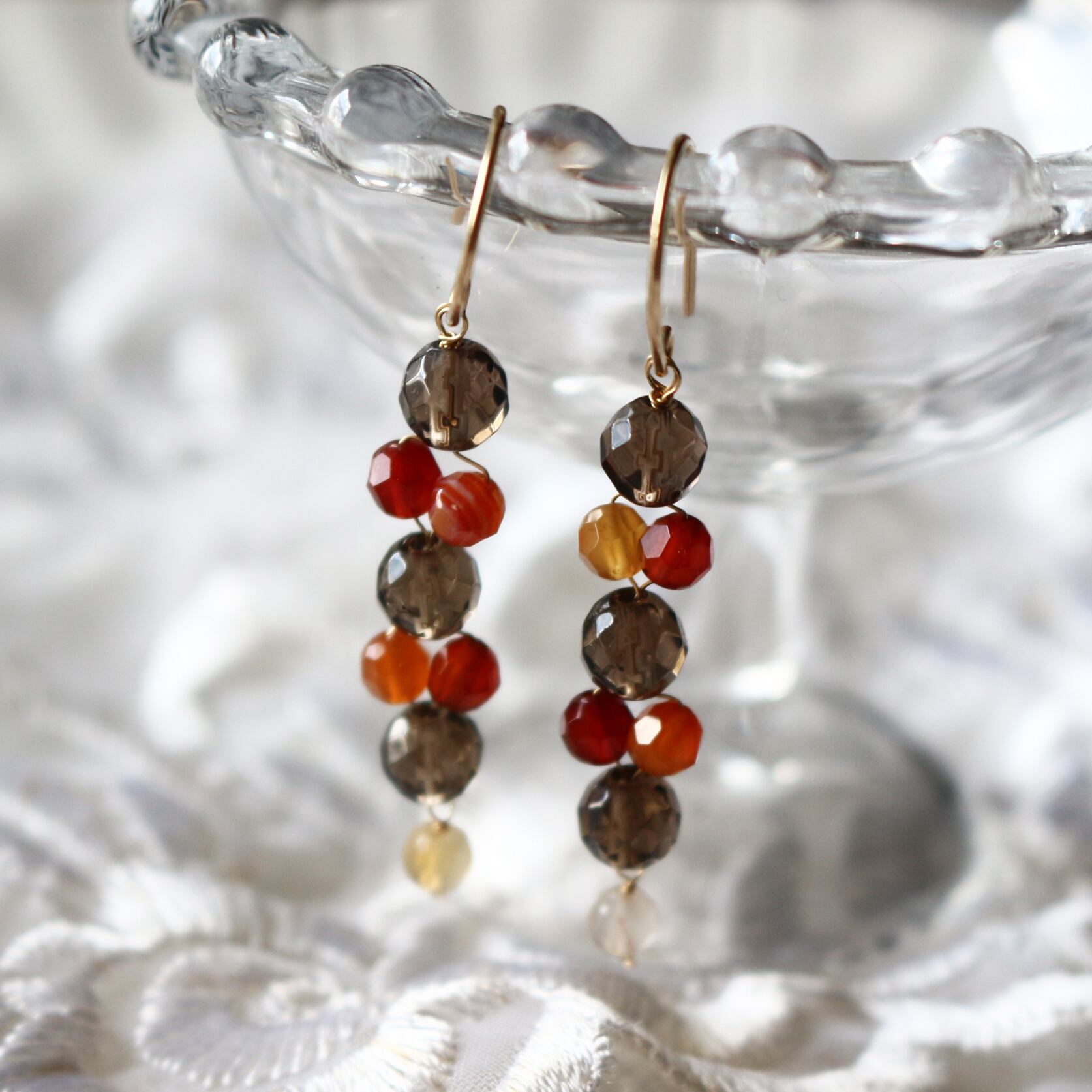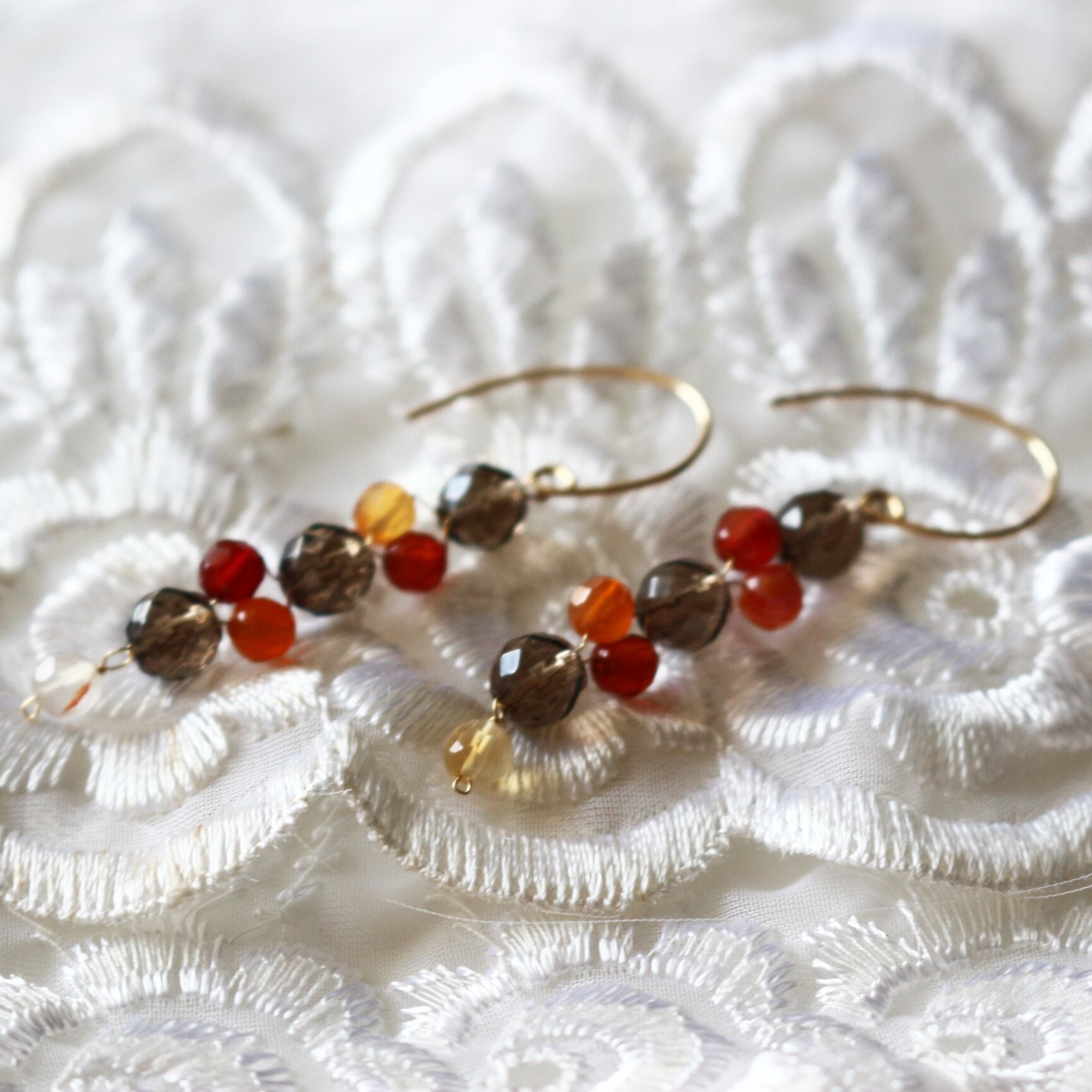 秋の実のようなスモーキークォーツとレッドアゲートのコロンとしたラウンドカットの天然石を繋げ、耳元で揺れるデザインとなっております。