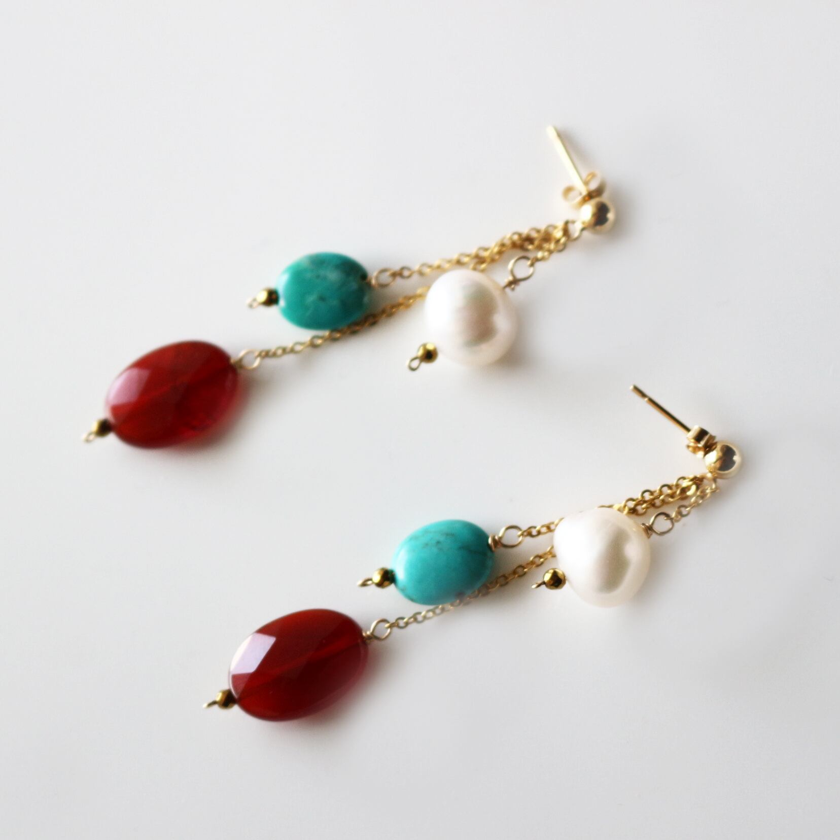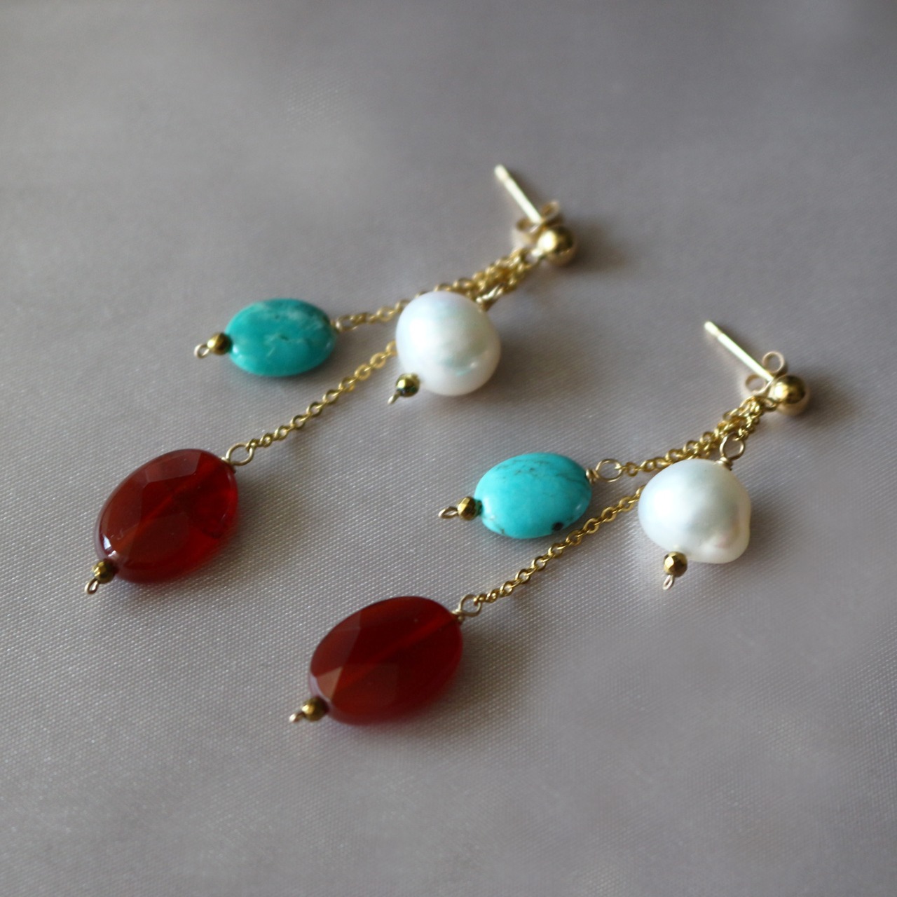 オリエンタルカラーをイメージし、淡水パール、ターコイズ、レッドアゲートを組み合わせました。
